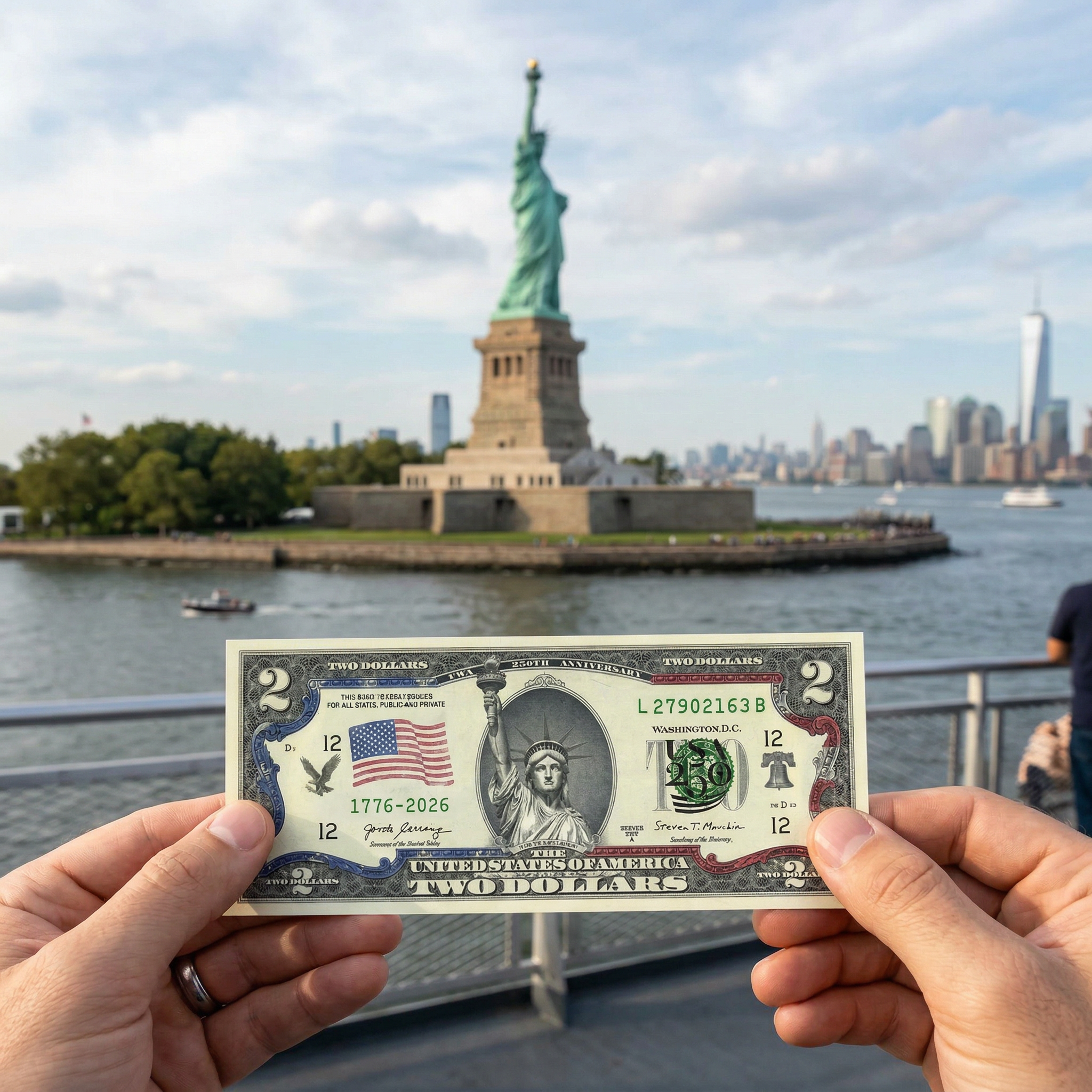 This exclusive America’s 250th Anniversary Collectible $2 Bill marks a historic first in U.S. currency design. For the first time ever, the Statue of Liberty stands proudly at the center of the bill, replacing Thomas Jefferson in a bold tribute to freedom, independence, and the enduring spirit of America.