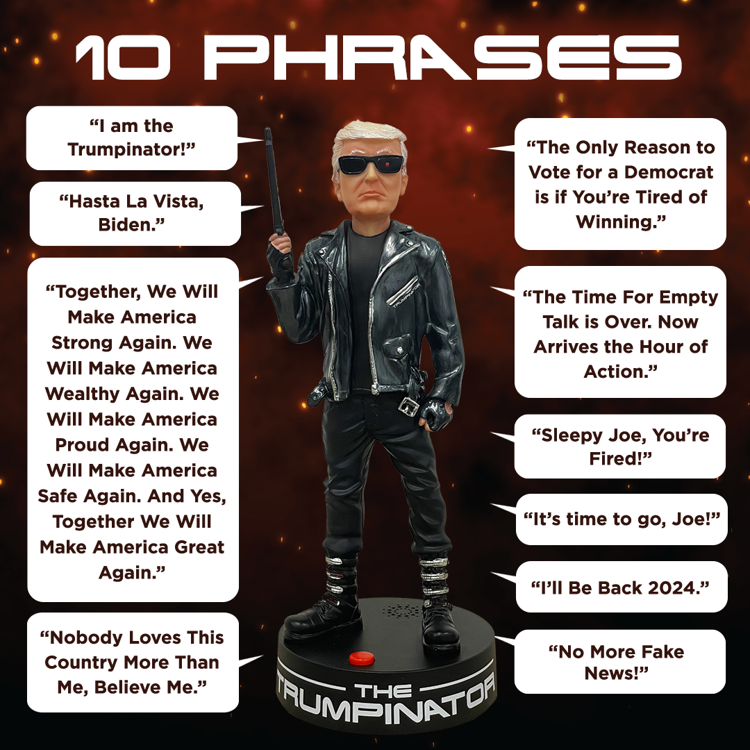 The Talking Trumpinator says 10 phrases with high-quality audio by simply pressing the button at the base of the figure. Each Talking Trumpinator comes in a collectors box with easy access to the button if you want to leave it in the box.