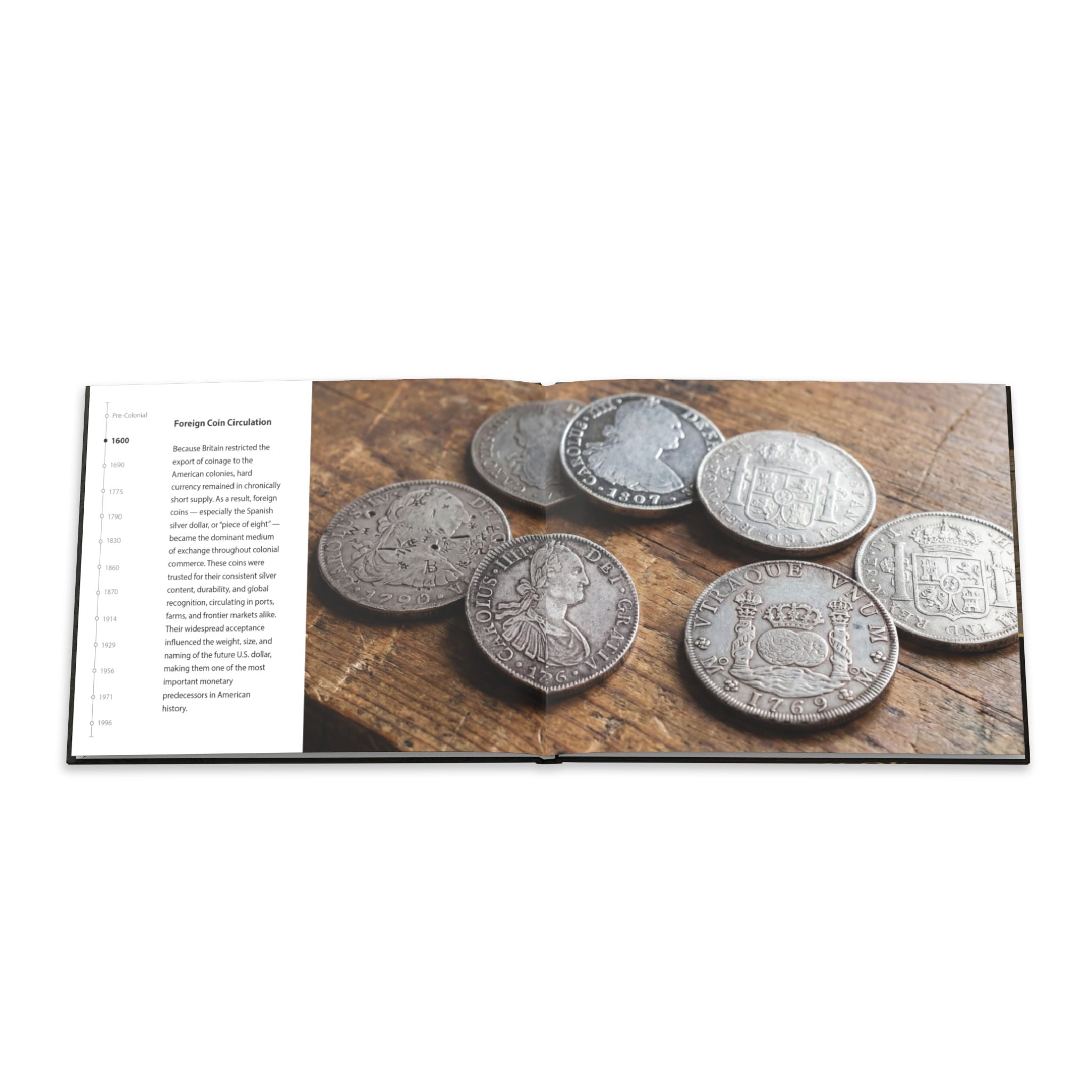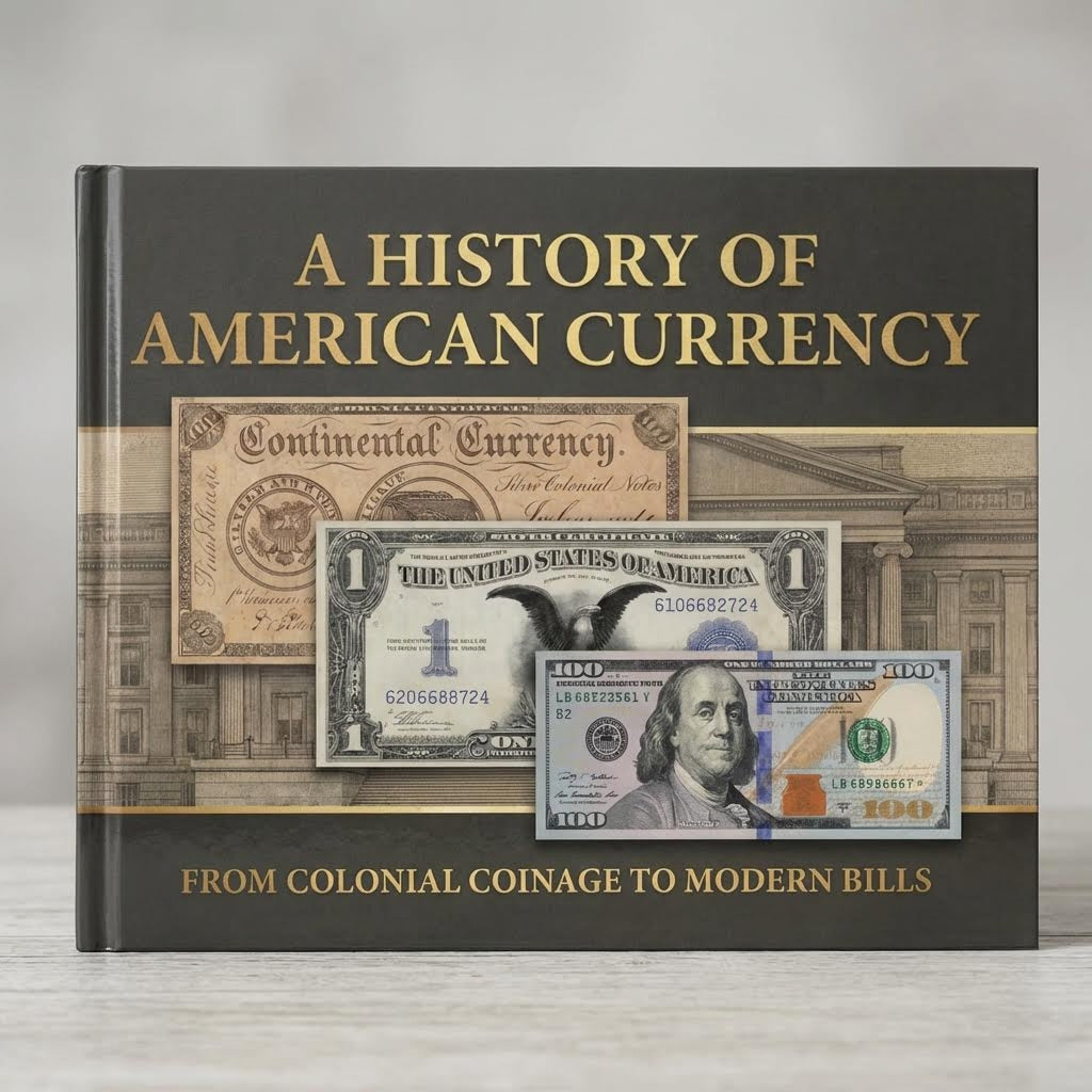 This curated 24-page hardcover photo book delivers a visual journey through the evolution of American currency. From early colonial notes and continental currency to iconic modern bills and the shift from gold-backed money to today’s fiat system, each spread captures pivotal eras with rich imagery and concise historical context.