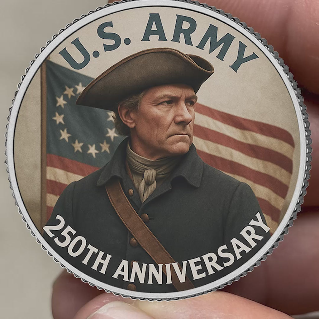 Celebrate this historic milestone with the limited-edition U.S. Army 250th Anniversary Half Dollar Coin — a striking tribute to American courage and commitment. This authentic U.S. Legal Tender coin has been beautifully enhanced using a cutting-edge high-definition colorization process, featuring a powerful image of a modern soldier with the American flag in the background.