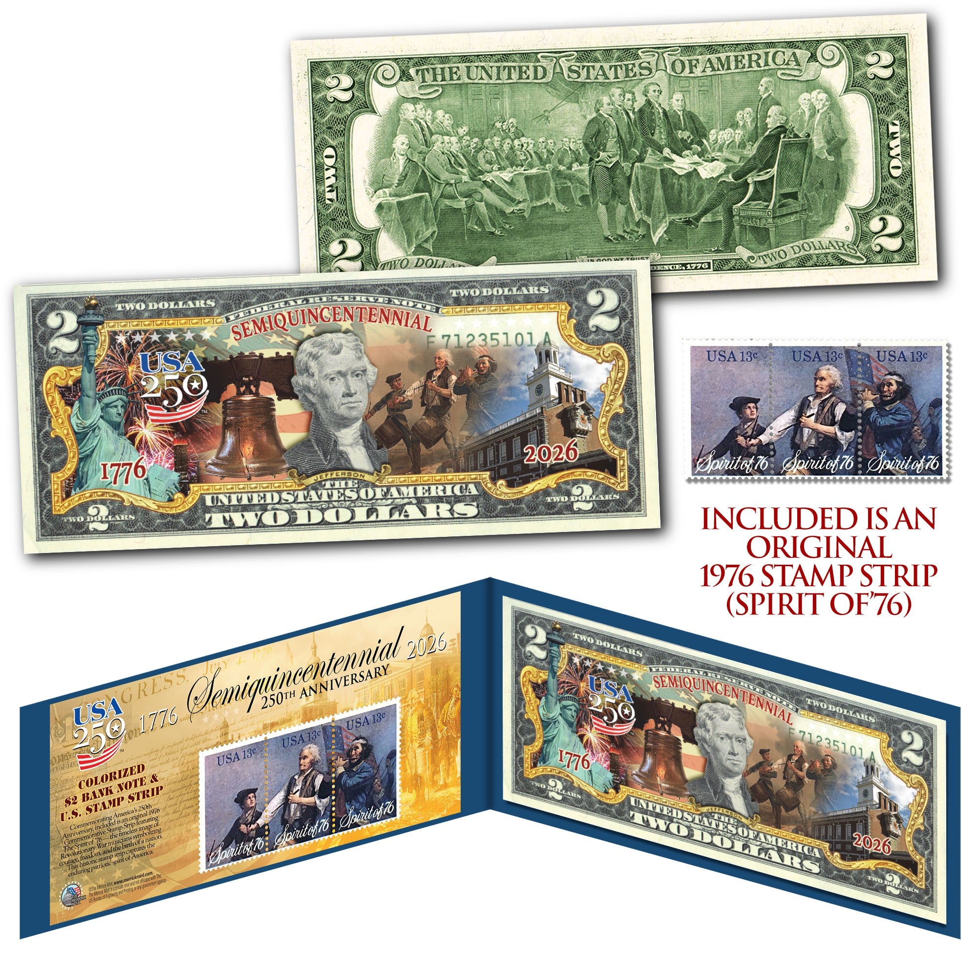 Paired with the bill is a genuine 1976 “Spirit of ’76” U.S. Postal 3-panel stamp strip, originally issued to commemorate the Bicentennial of the United States. These authentic stamps serve as a powerful reminder of America’s resilience and revolutionary spirit.