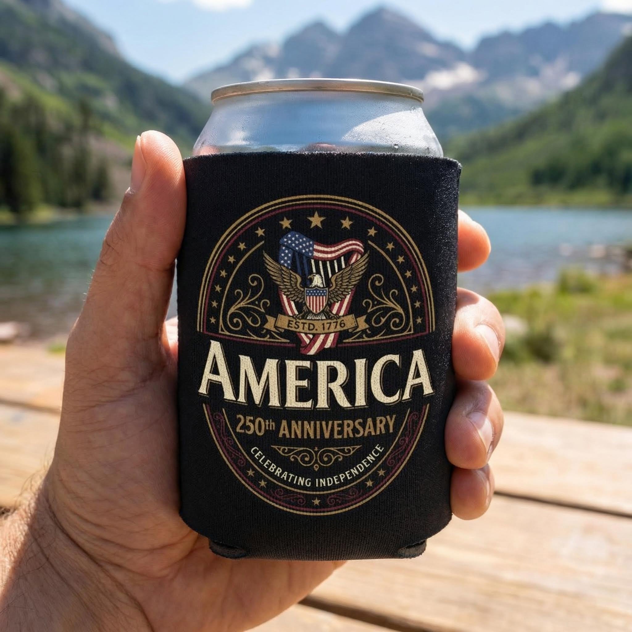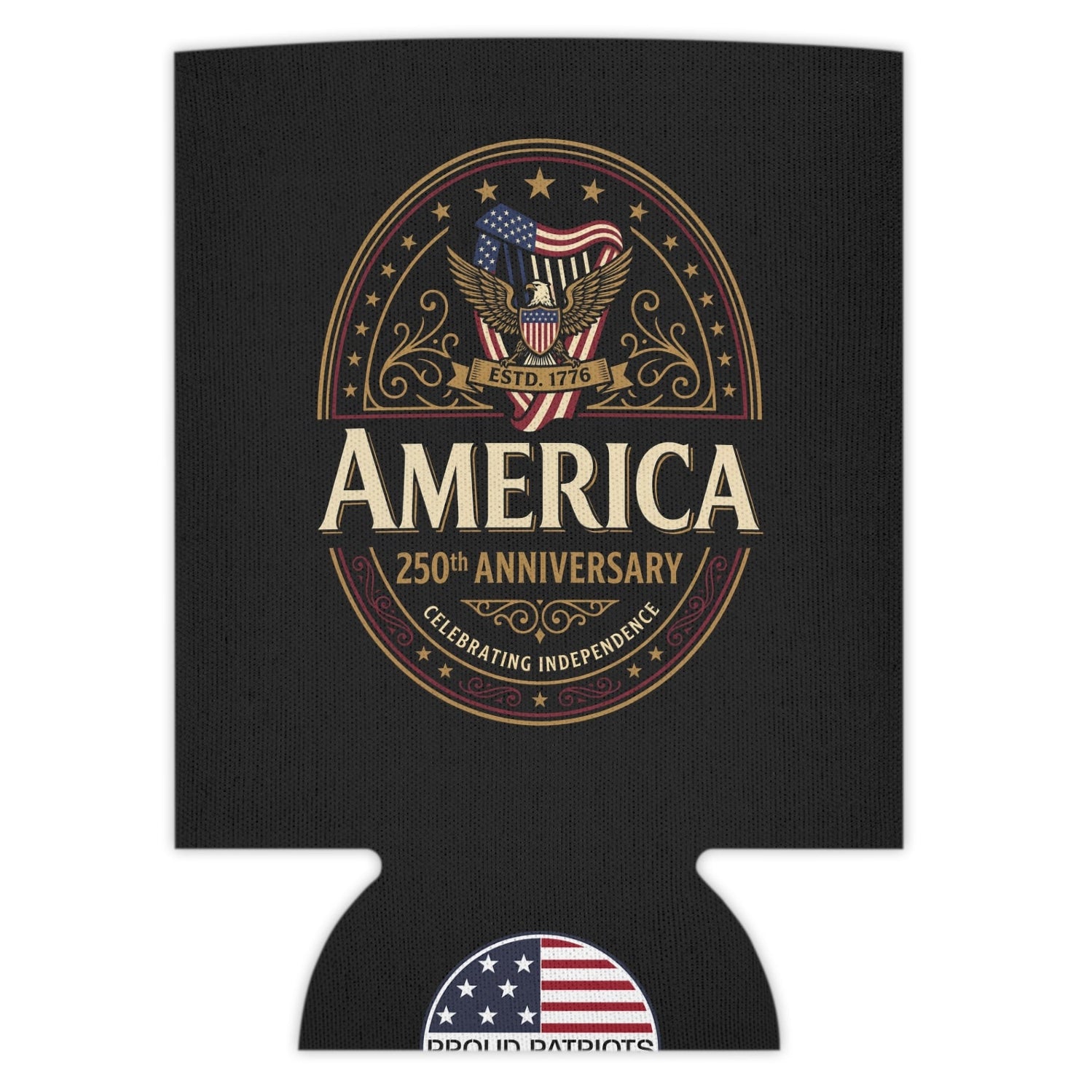 For a more refined, heirloom feel, this black can cooler features an ornate gold-accented eagle crest celebrating 250 years of independence. The darker backdrop gives the design a distinguished, almost collectible look—something that feels equally at home at a tailgate or displayed on a bar top.