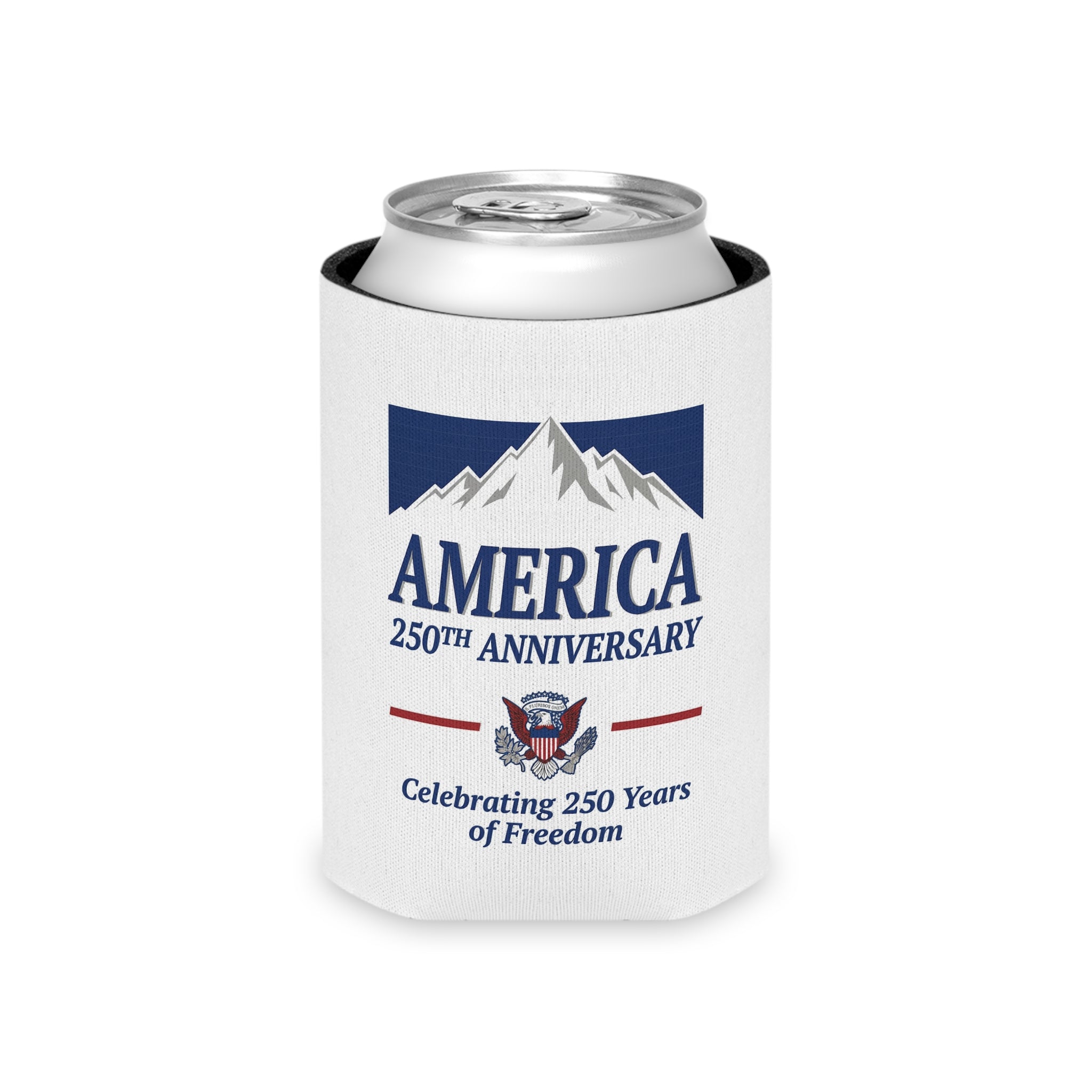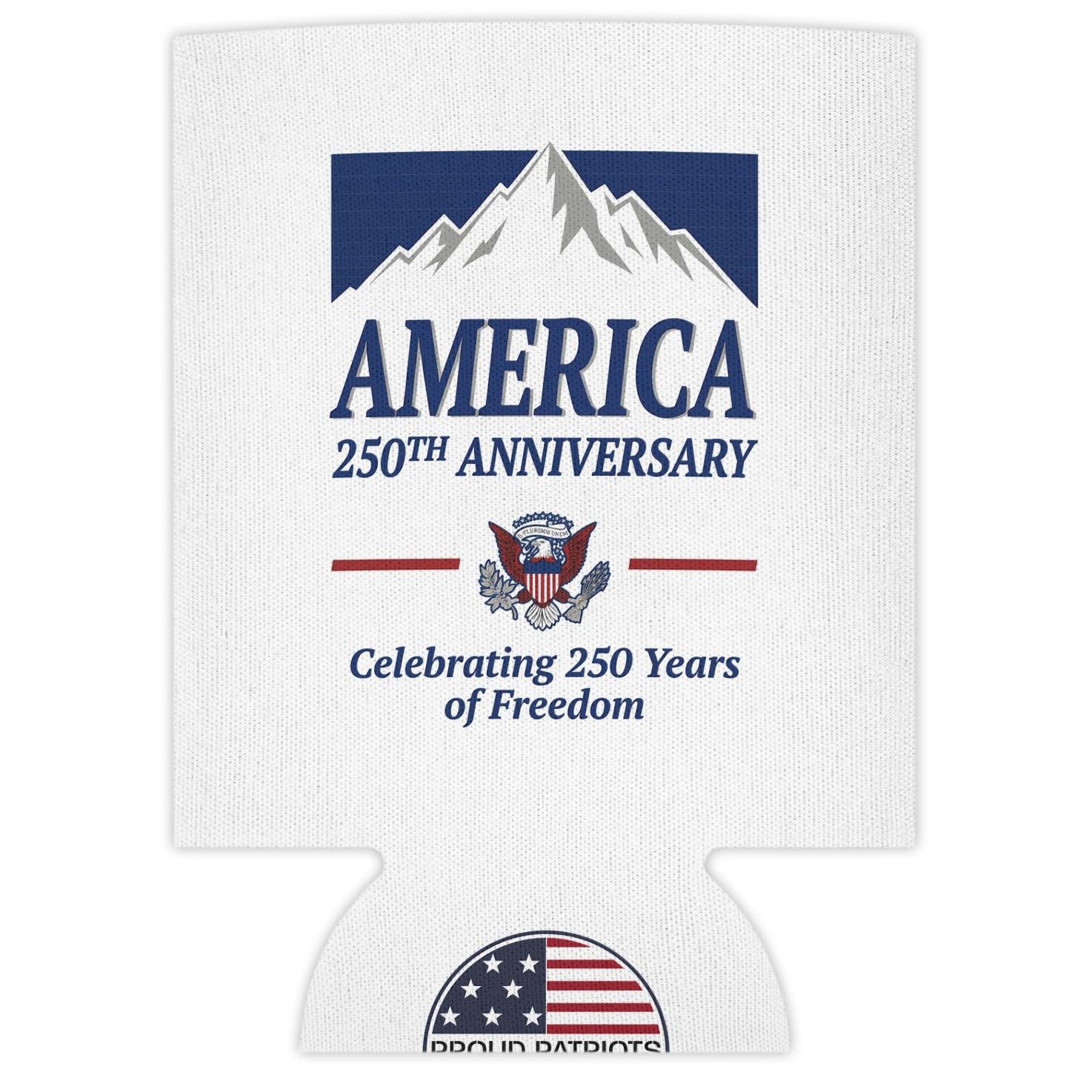 Simple, strong, and quietly patriotic, this cooler features a mountain-top graphic above bold anniversary lettering. The clean white field and restrained color palette give it a modern Americana feel—less parade, more open sky and wide horizons.