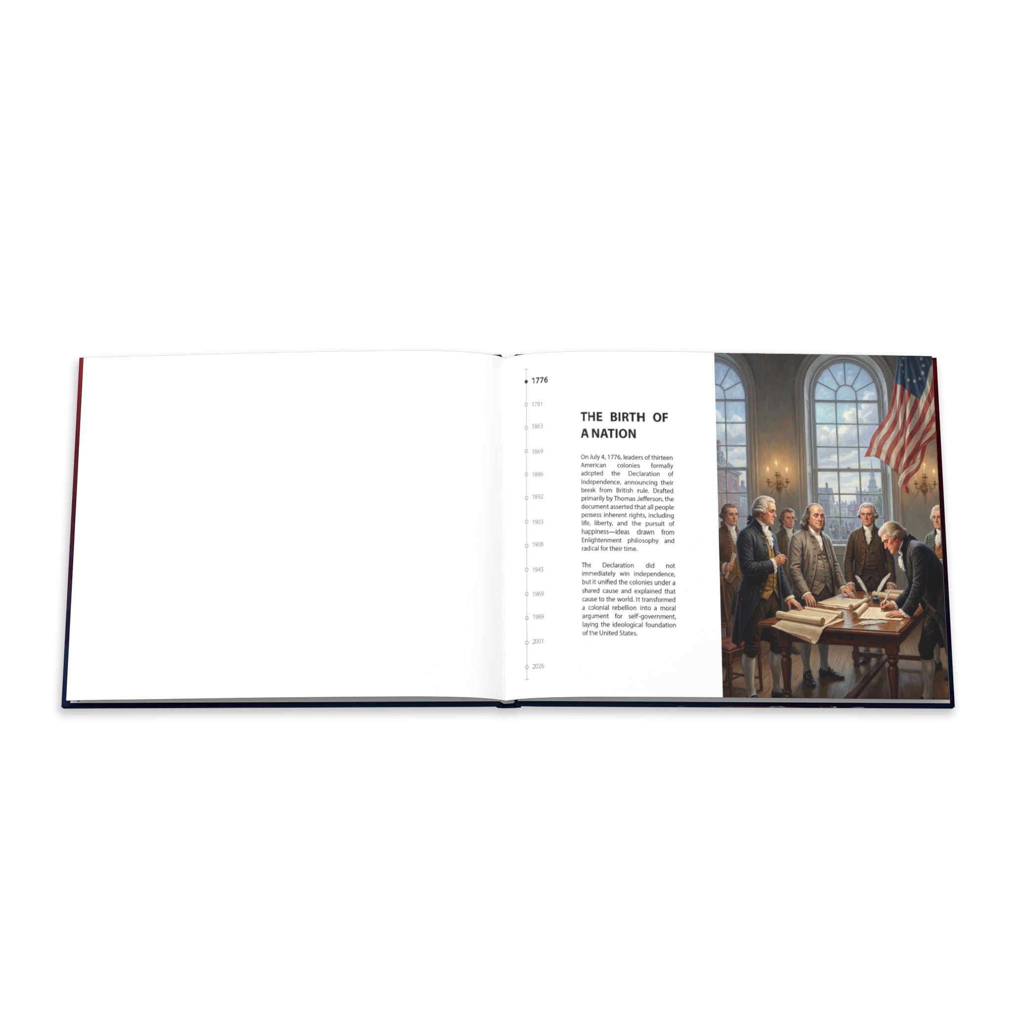 Bound in a sturdy, museum-quality hardcover, this keepsake volume carries the weight and presence of a true heirloom. Inside, archival semi-gloss pages showcase each illustration and historical moment with rich color, sharp detail, and lasting clarity. The thoughtfully designed timeline layout allows each spread to read like a visual story, guiding readers through America’s legacy in a steady, dignified flow.