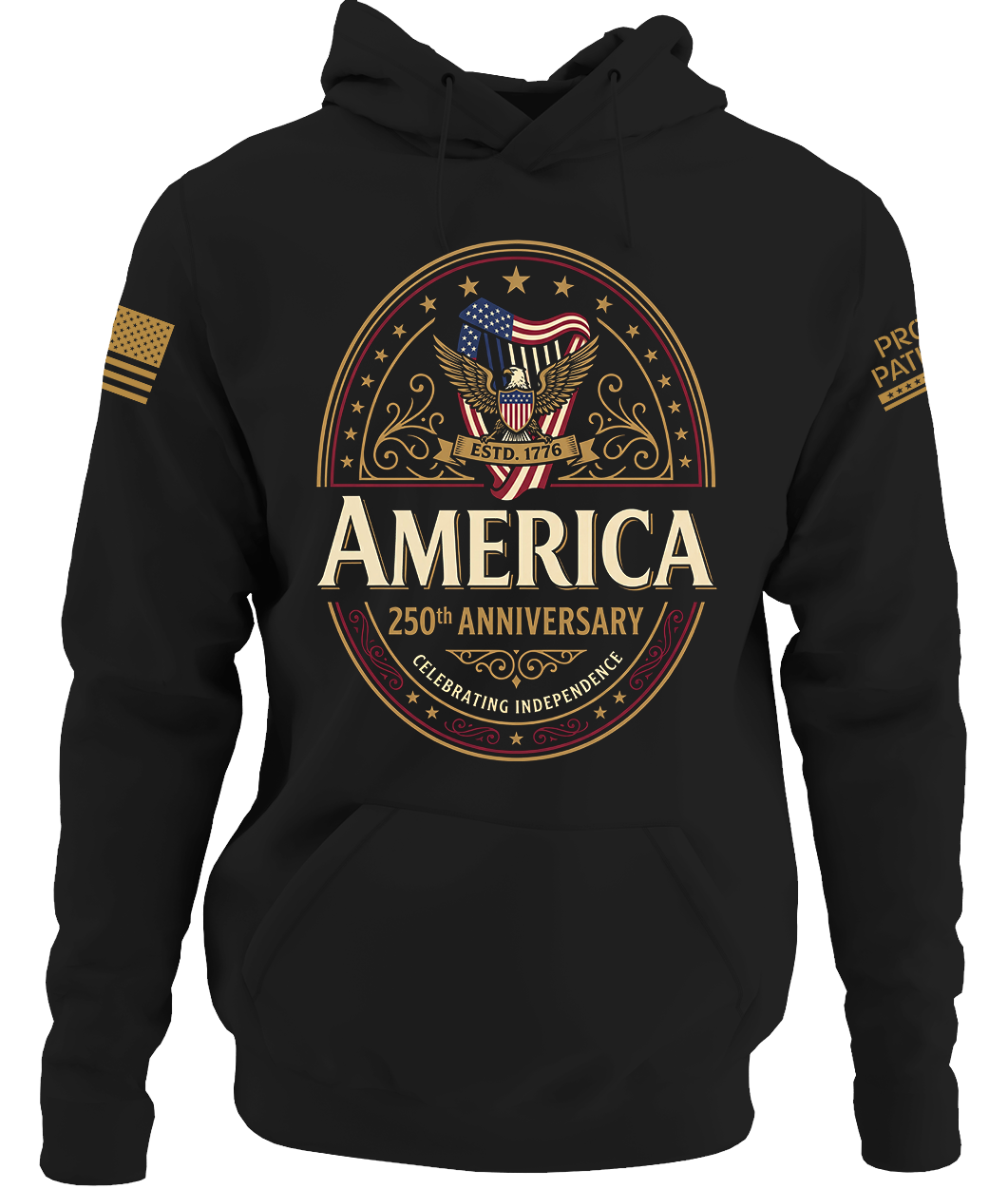 Proudly printed and shipped in America, with an American Flag and Proud Patriots logo on the sleeves!