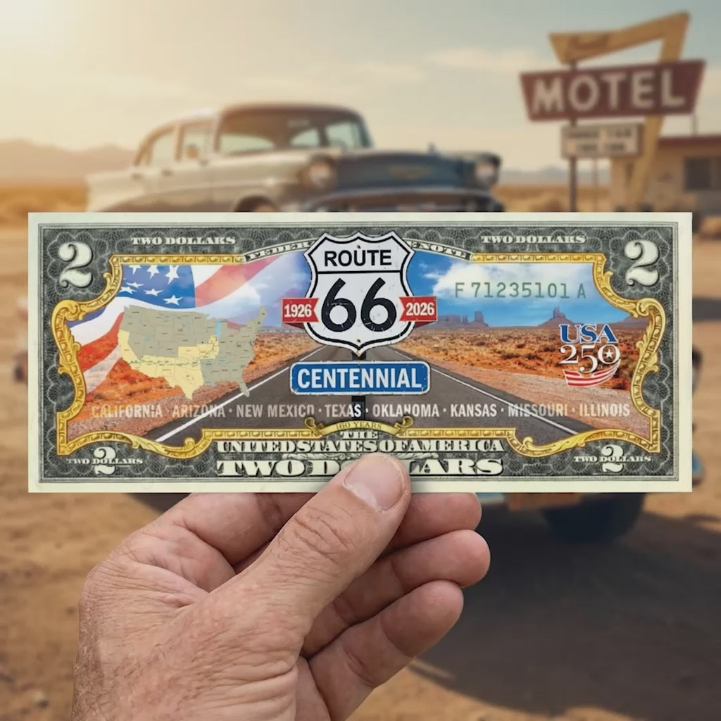 Route 66 Centennial (1926 - 2026) Genuine Legal Tender $2 Bill – USA 250th Collector's Edition