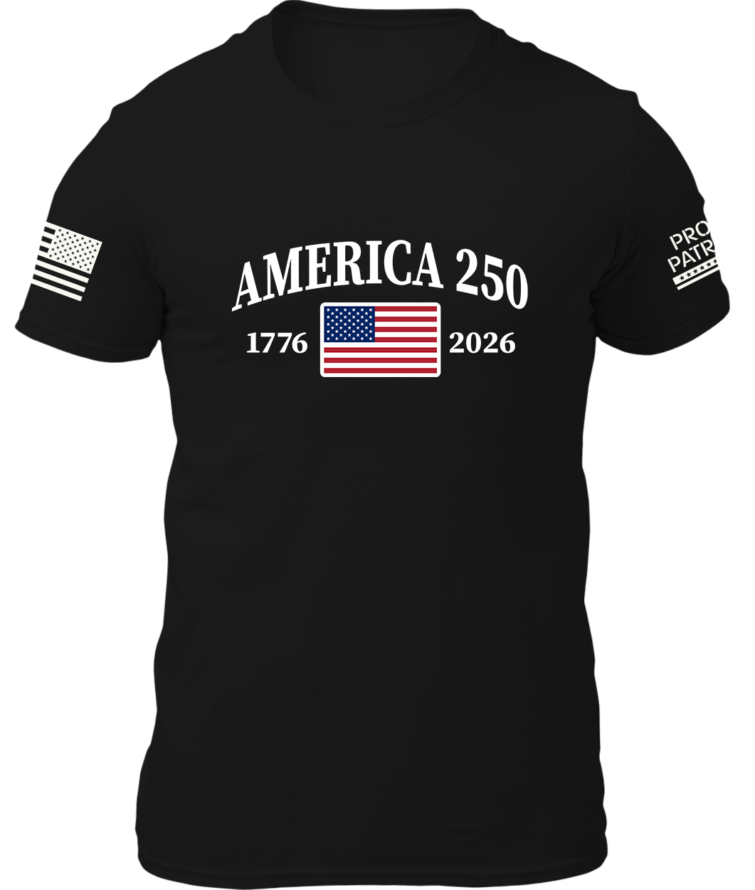 - Bold front print + American flag and Proud Patriot logos on sleeves