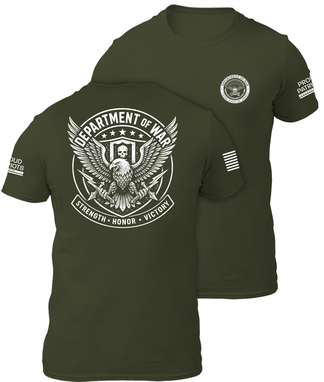 On the back, a battle eagle with wings spread wide dominates the design, clutching lightning bolts over a warrior’s shield, framed by the words “Strength • Honor • Victory.” On the front chest, a Department of War crest makes a powerful statement, while the sleeves proudly display the American flag and Proud Patriots logos.
