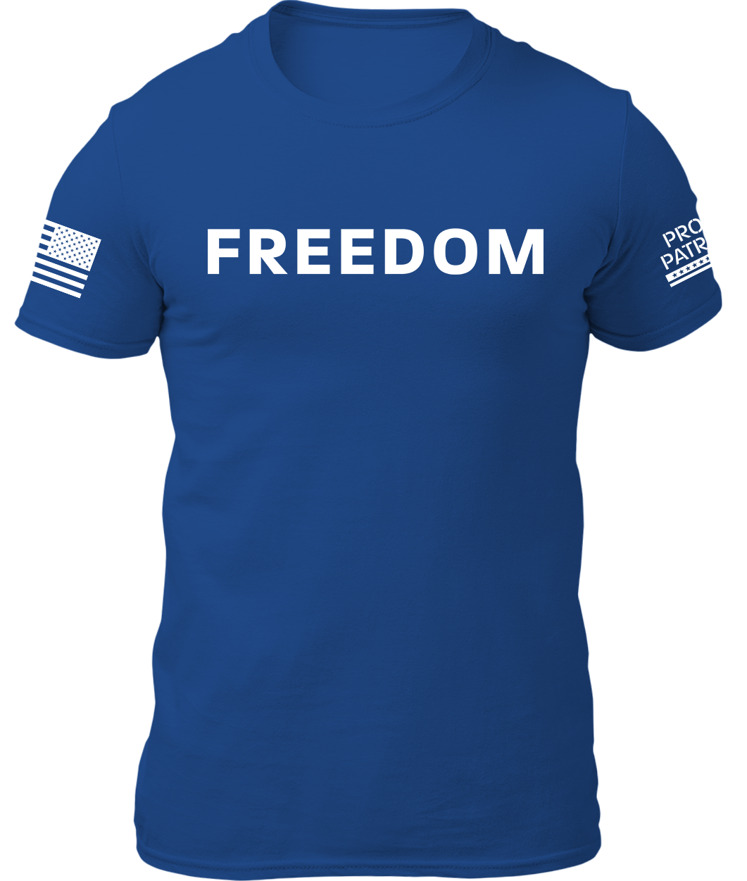 - Bold front print + American flag and Proud Patriot logos on sleeves
