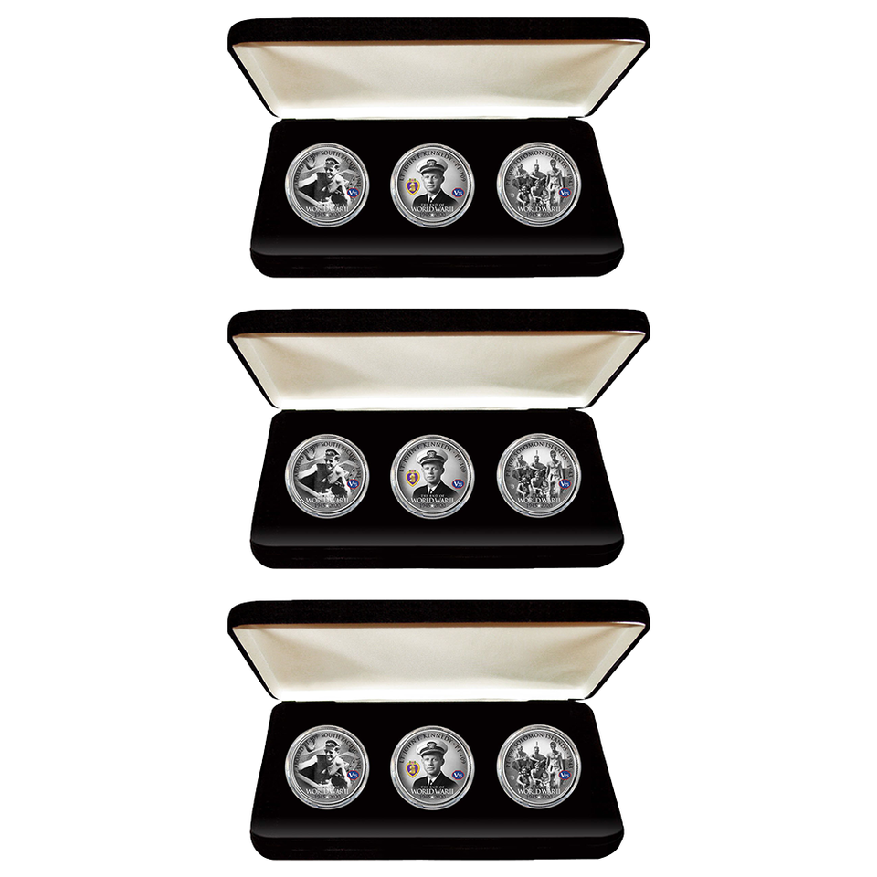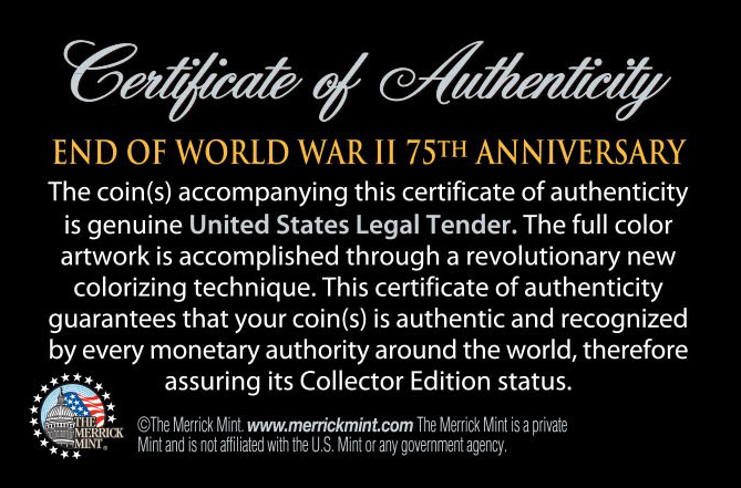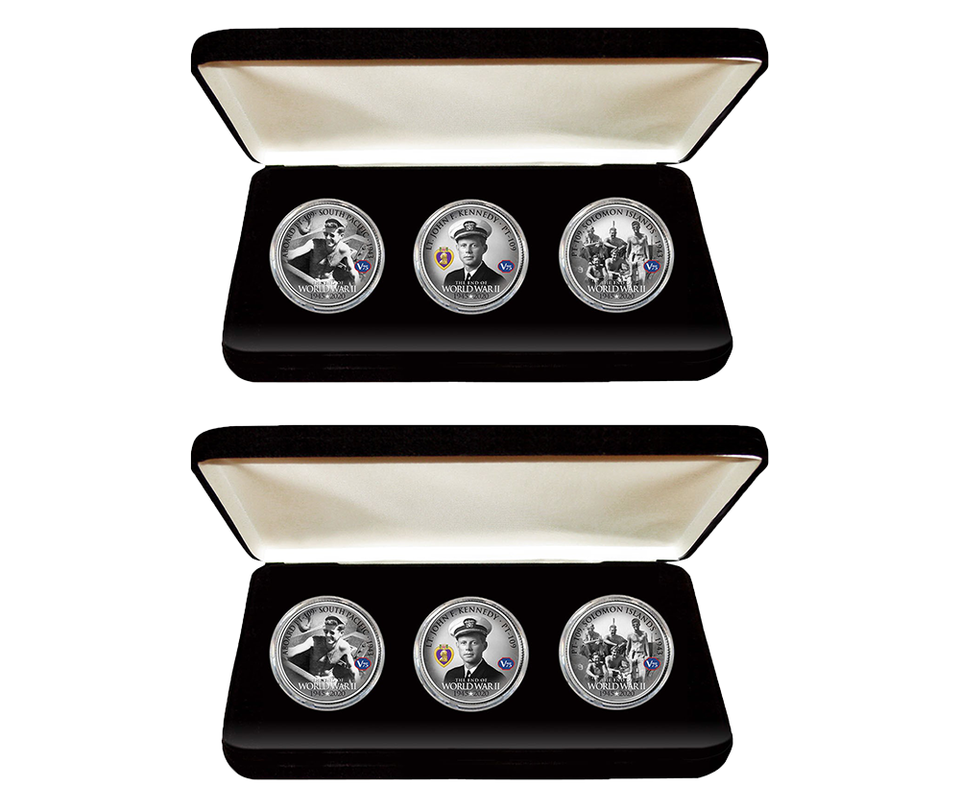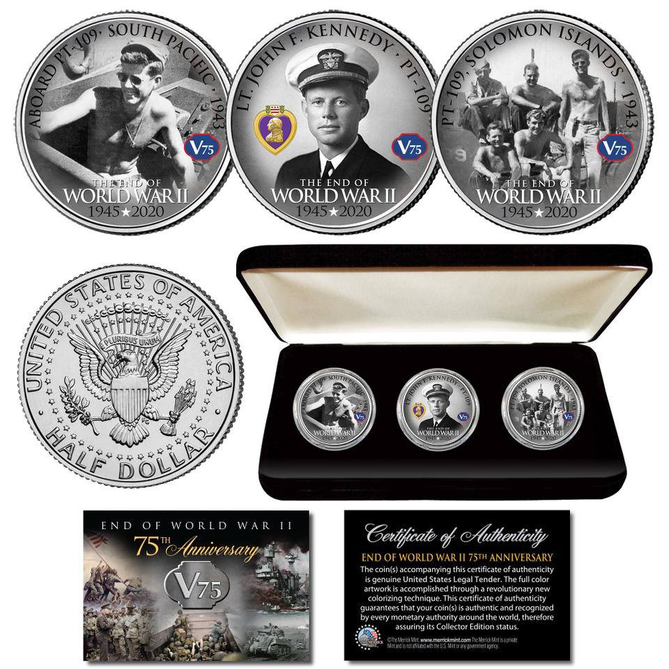 The 'WWII 75th Anniversary' JFK Half-Dollar Coin Set includes three authentic U.S. coins with a beautifully designed image honoring one of our greatest presidents who fought for American freedom during WWII, John F. Kennedy and the 75th Anniversary Privy Mark on the front celebrating the end of WWII. Each coin comes with a certificate of authenticity, a beautiful acrylic case, and display case for all three coins