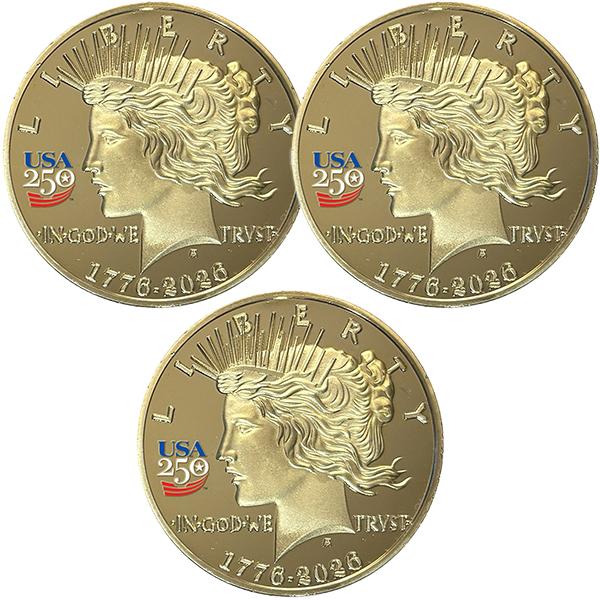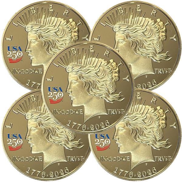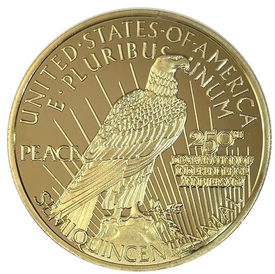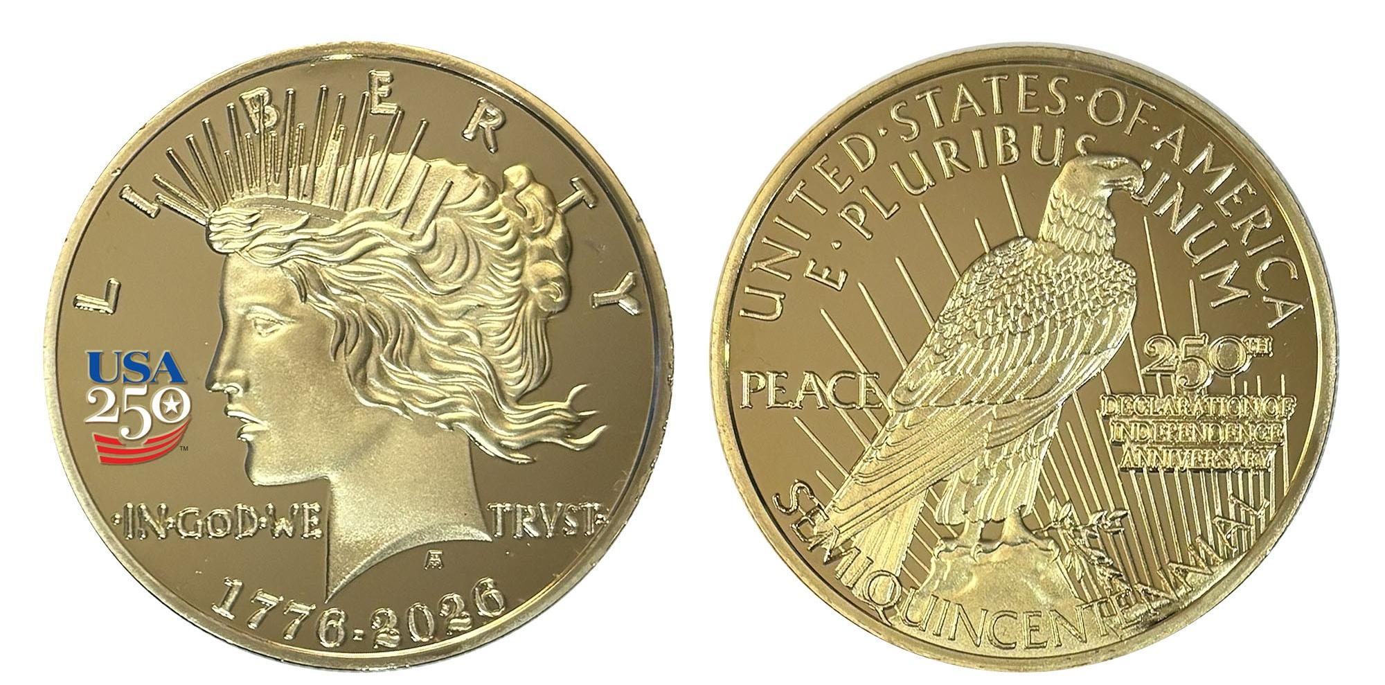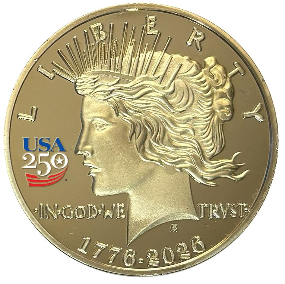 This exclusive, privately minted non-monetary America 250th Anniversary Peace Dollar Golden Proof Coin. Weighing approximately one ounce and measuring 39mm, this coin is struck in Golden Proof.