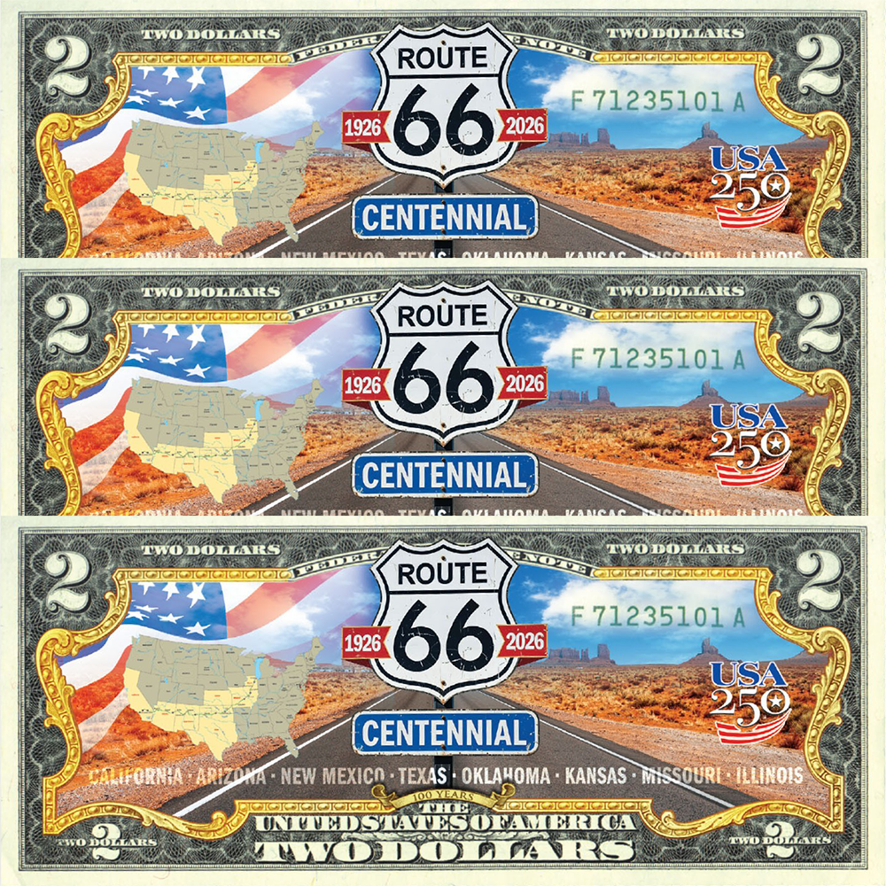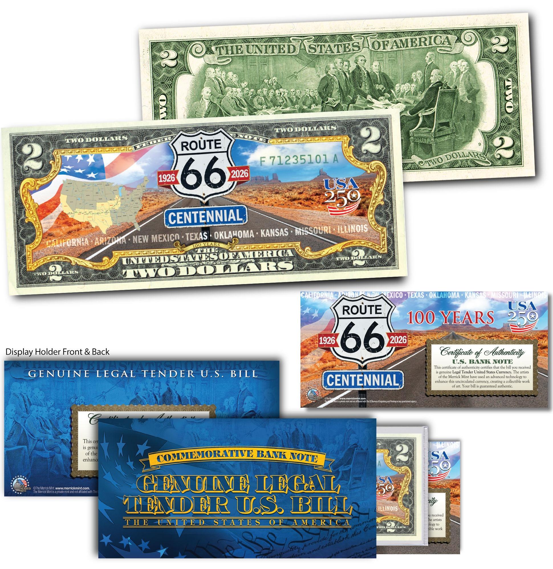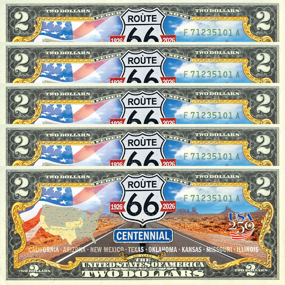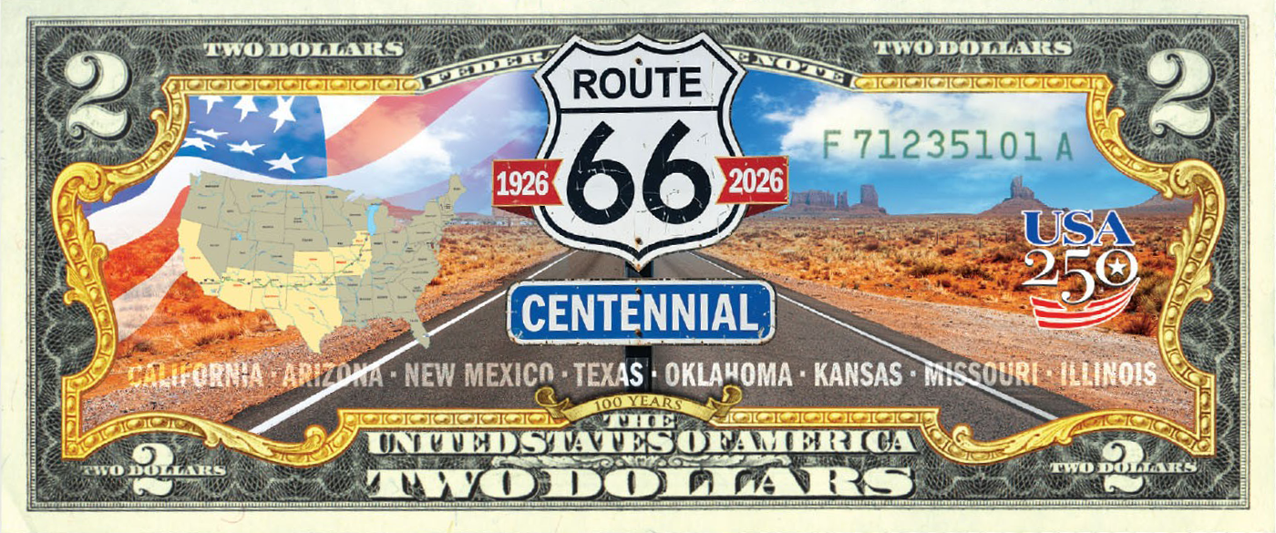 Route 66 Centennial (1926 - 2026) Genuine Legal Tender $2 Bill – USA 250th Collector's Edition