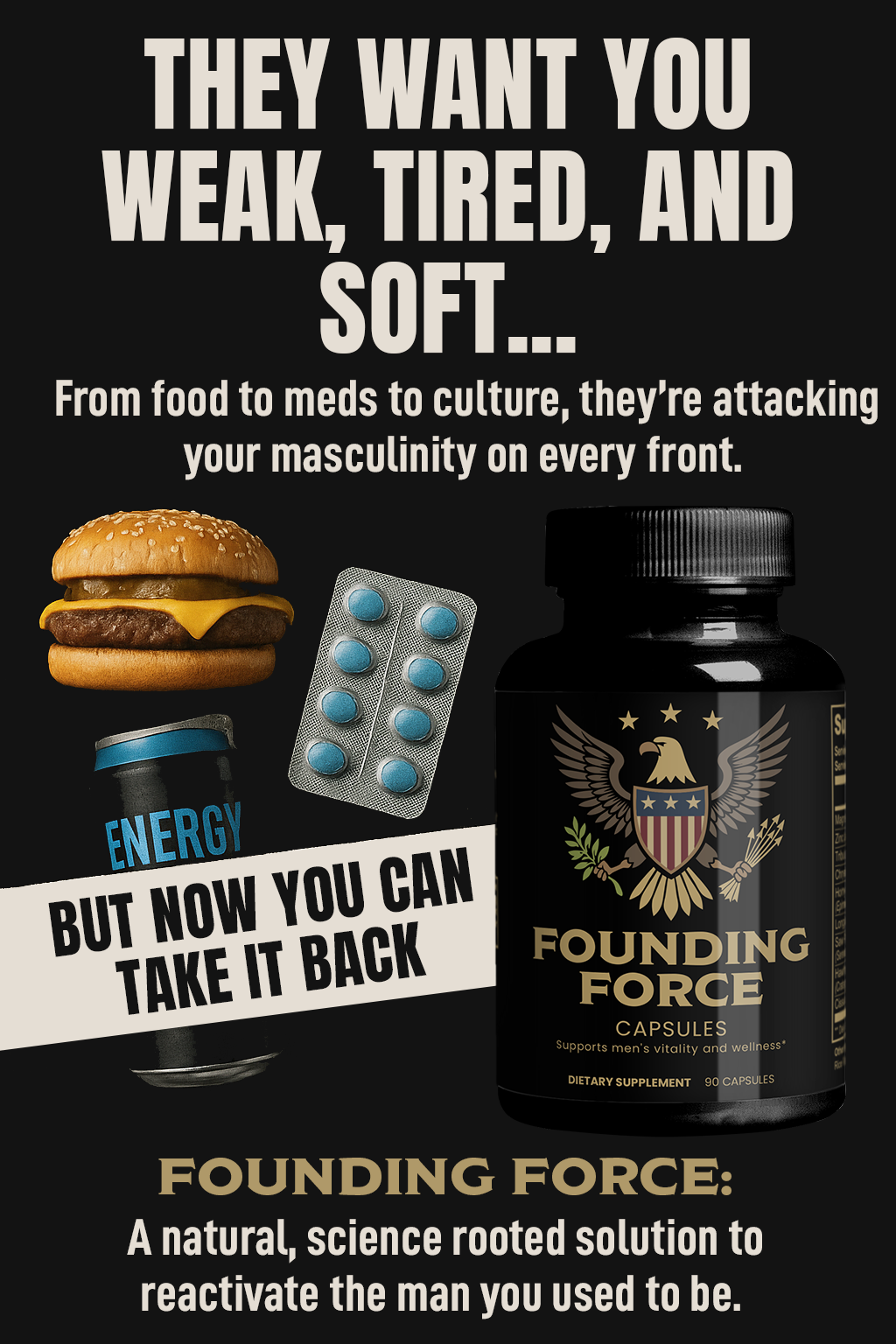 Founding Force is built for men who still believe strength, stamina, and testosterone matter. If you're over 40 and feeling like your energy, muscle, or bedroom performance just isn't what it used to be — even if you're eating clean and working out — this was made for you.