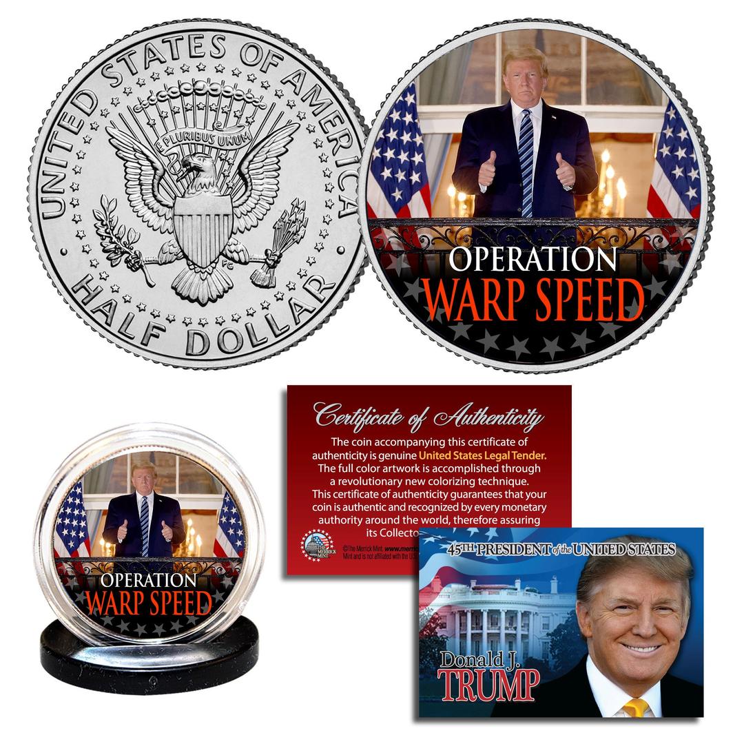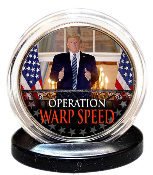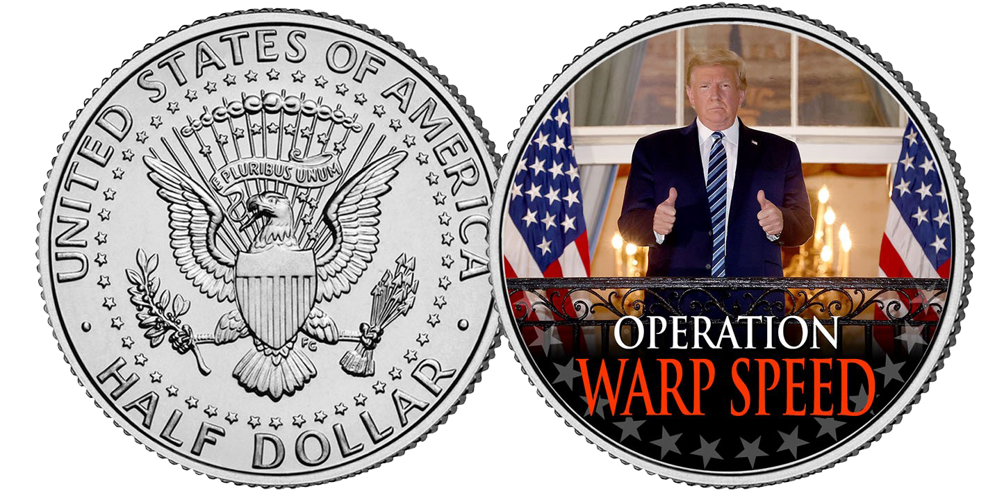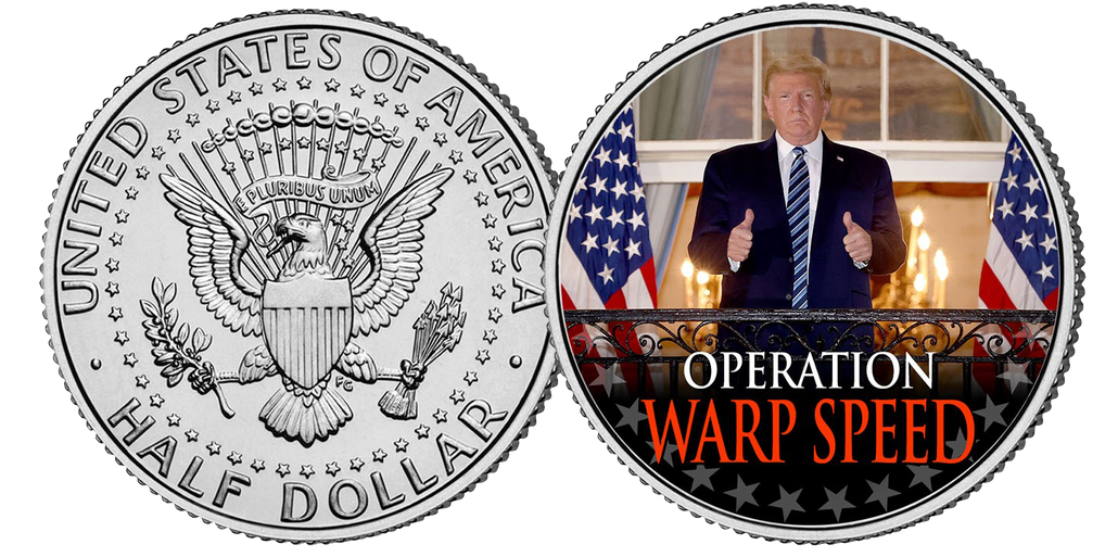 The 'Operation Warp Speed' Half-Dollar Coin includes an authentic U.S. coin with the United States President Donald Trump giving us his best wishes. Each coin comes with a certificate of authenticity and is showcased in a beautiful acrylic case.