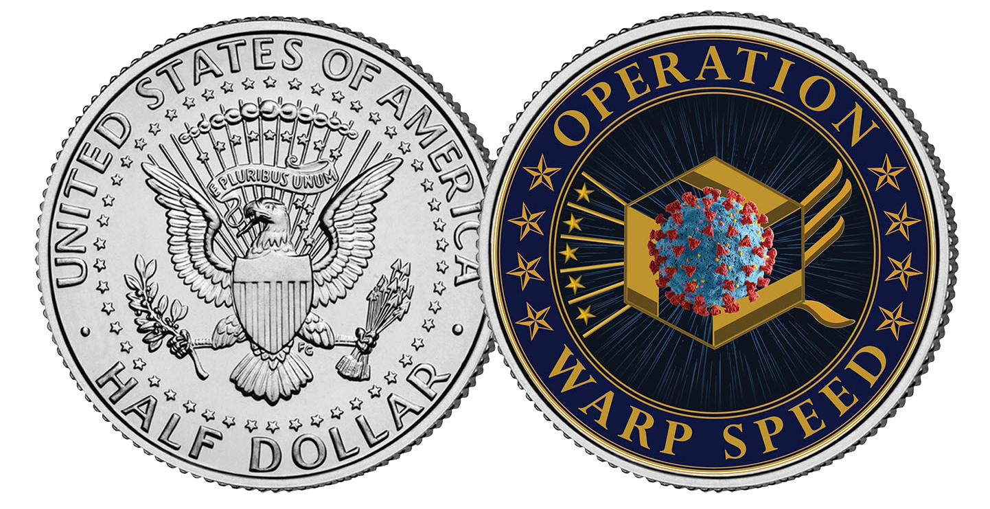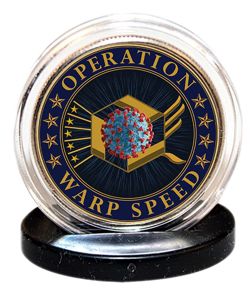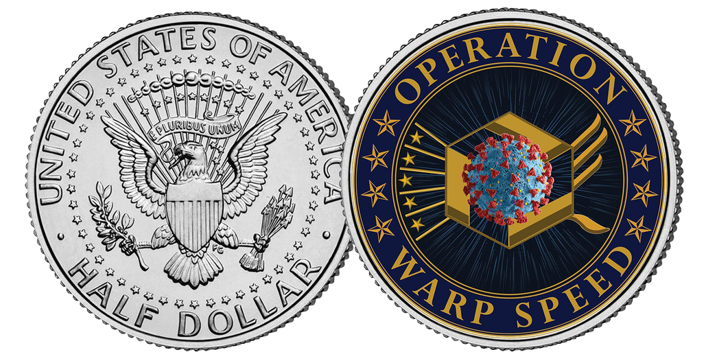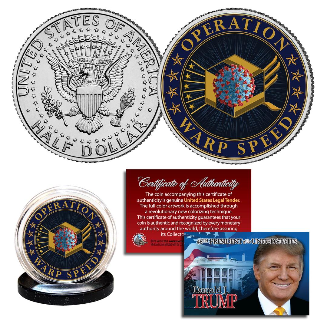 The 'Operation Warp Speed' Half-Dollar Coin includes an authentic U.S. coin with the United States President Donald Trump giving us his best wishes. Each coin comes with a certificate of authenticity and is showcased in a beautiful acrylic case.