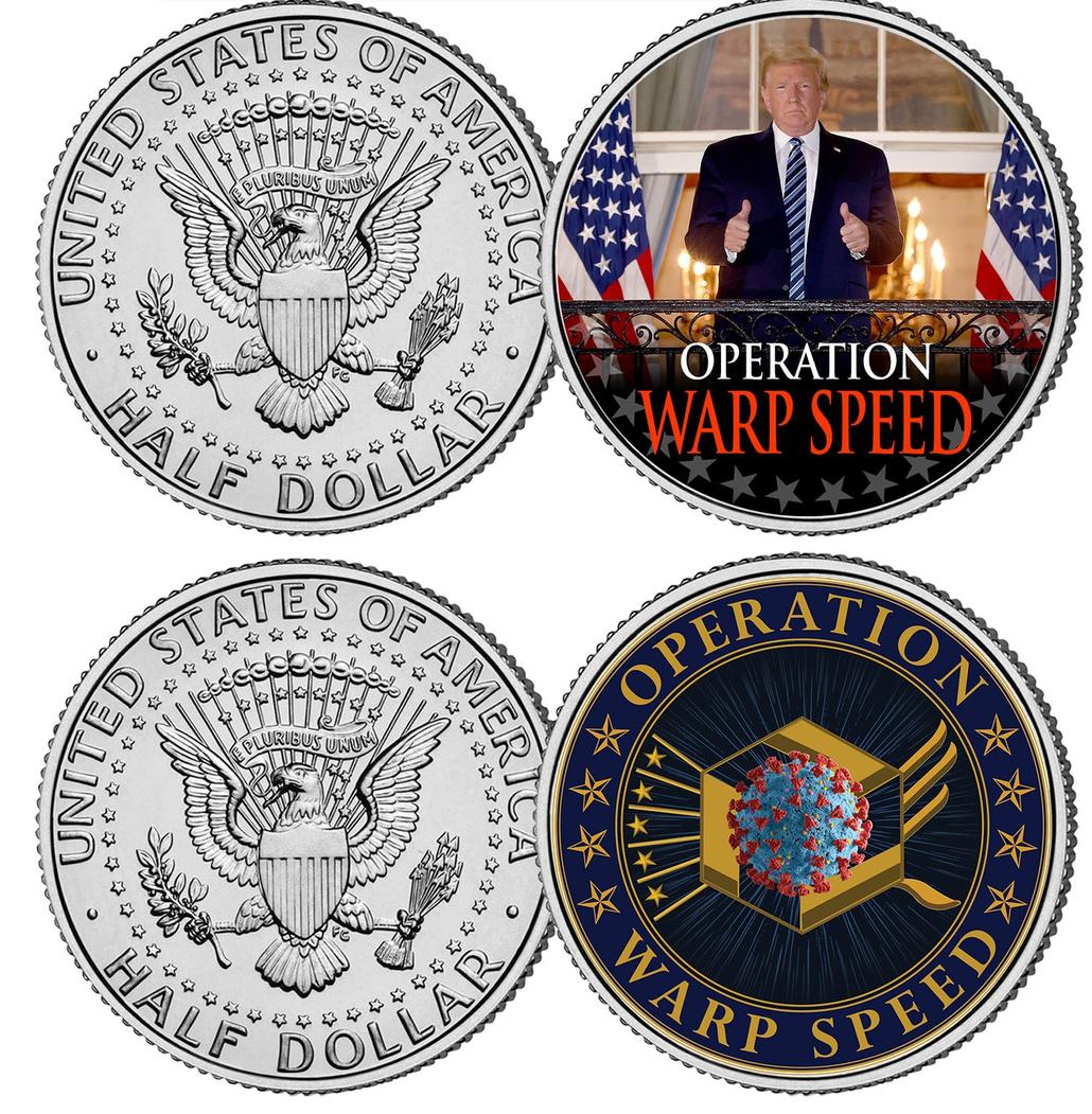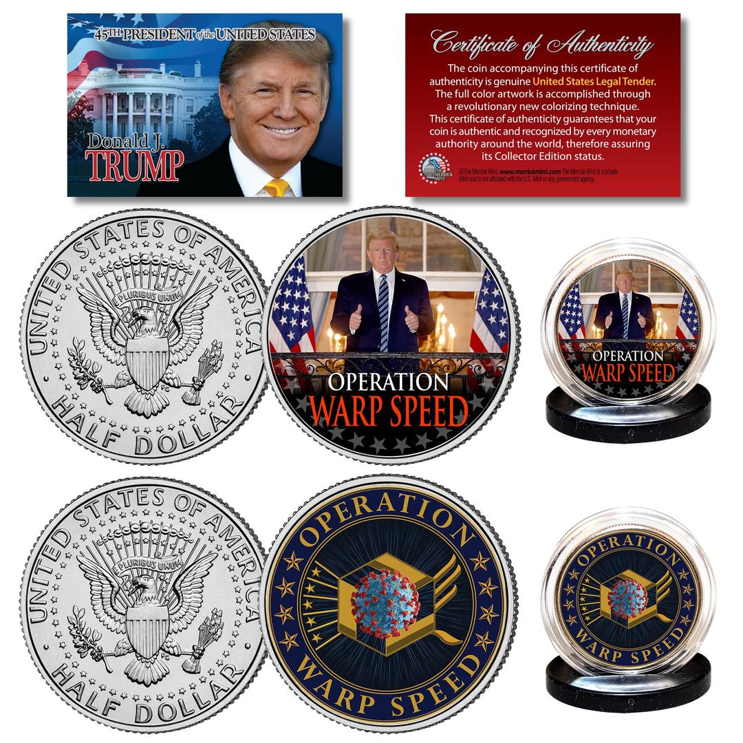 The 'Operation Warp Speed' Half-Dollar Coin includes an authentic U.S. coin with the United States President Donald Trump giving us his best wishes. Each coin comes with a certificate of authenticity and is showcased in a beautiful acrylic case.