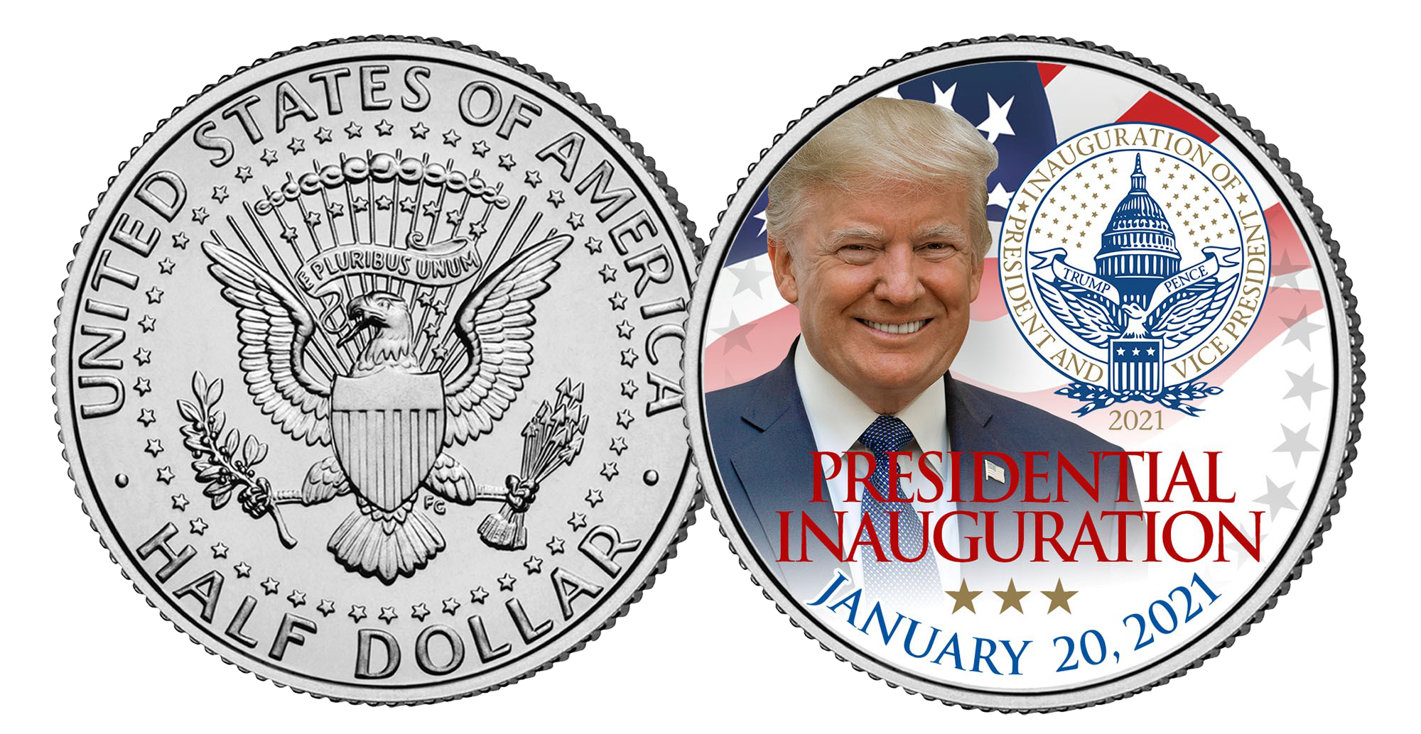 The '2021 Inauguration' Trump Coin includes an authentic JFK Half-Dollar with President Trump on the front along with the date and design unique to Trump's 2021 Inauguration.