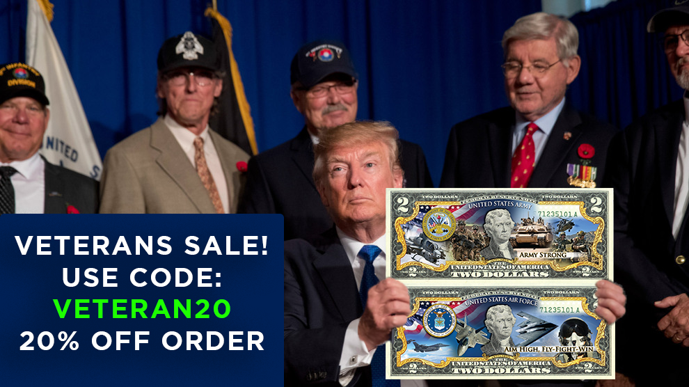 Celebrate Veterans with our collectible $2 bills. Each $2 Bill is in FRESH, CRISP, UNCIRCULATED condition, and was directly removed from untouched wrapped Federal Reserve sealed packs. Former U.S. President Thomas Jefferson is featured on the obverse of the note, along with the special colorization overlay. Each Bill comes with a certificate of authenticity and a display holder.