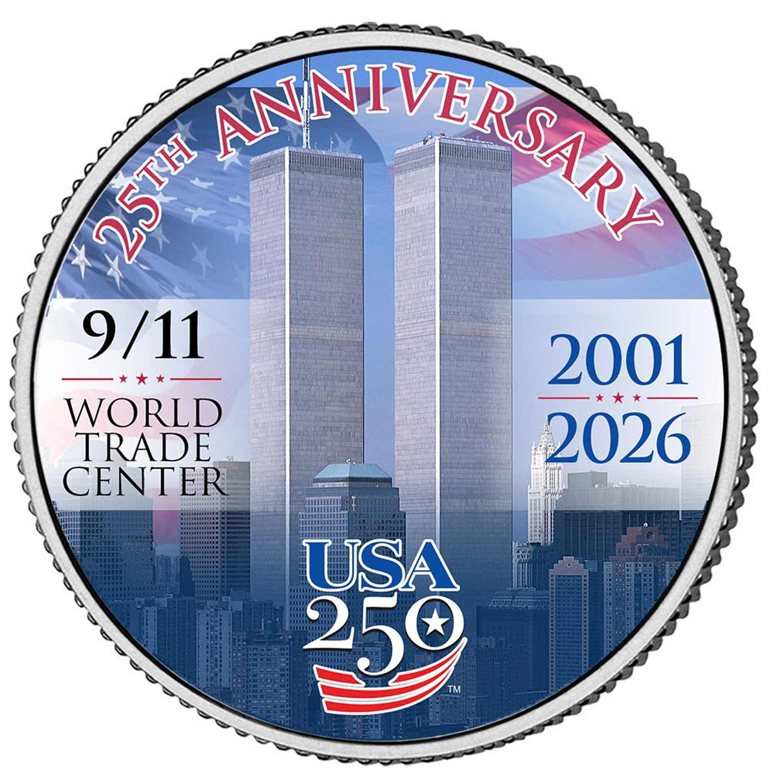 The Mint has authorized a release of this collectible half dollar coin to commemorate the upcoming 25th Anniversary of September 11th that also coincides with the 250th Anniversary of America.