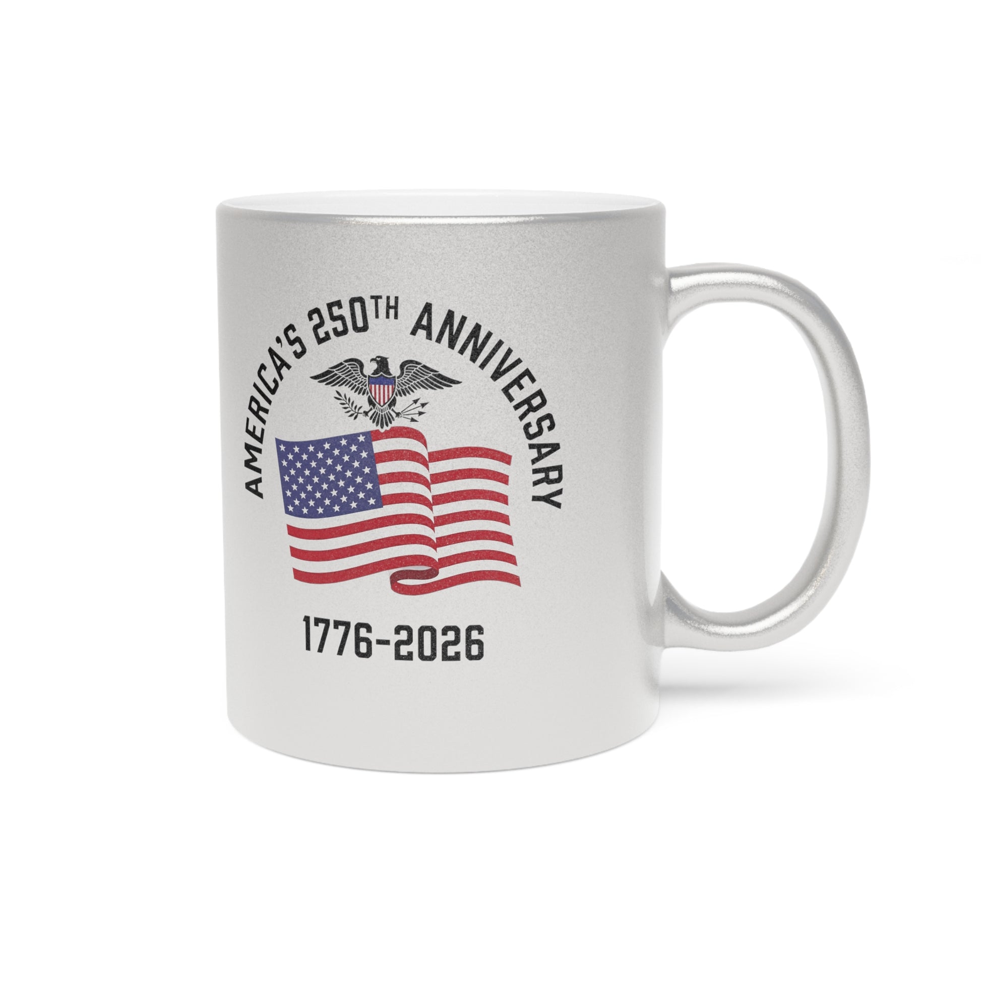 Honor a once-in-a-generation milestone with every sip. This America’s 250th Anniversary Silver Metallic Mug celebrates 1776–2026 with a bold patriotic design set against a sleek, reflective silver finish. The metallic exterior catches the light beautifully, giving the mug a polished, commemorative look that stands out whether it’s in use or on display.