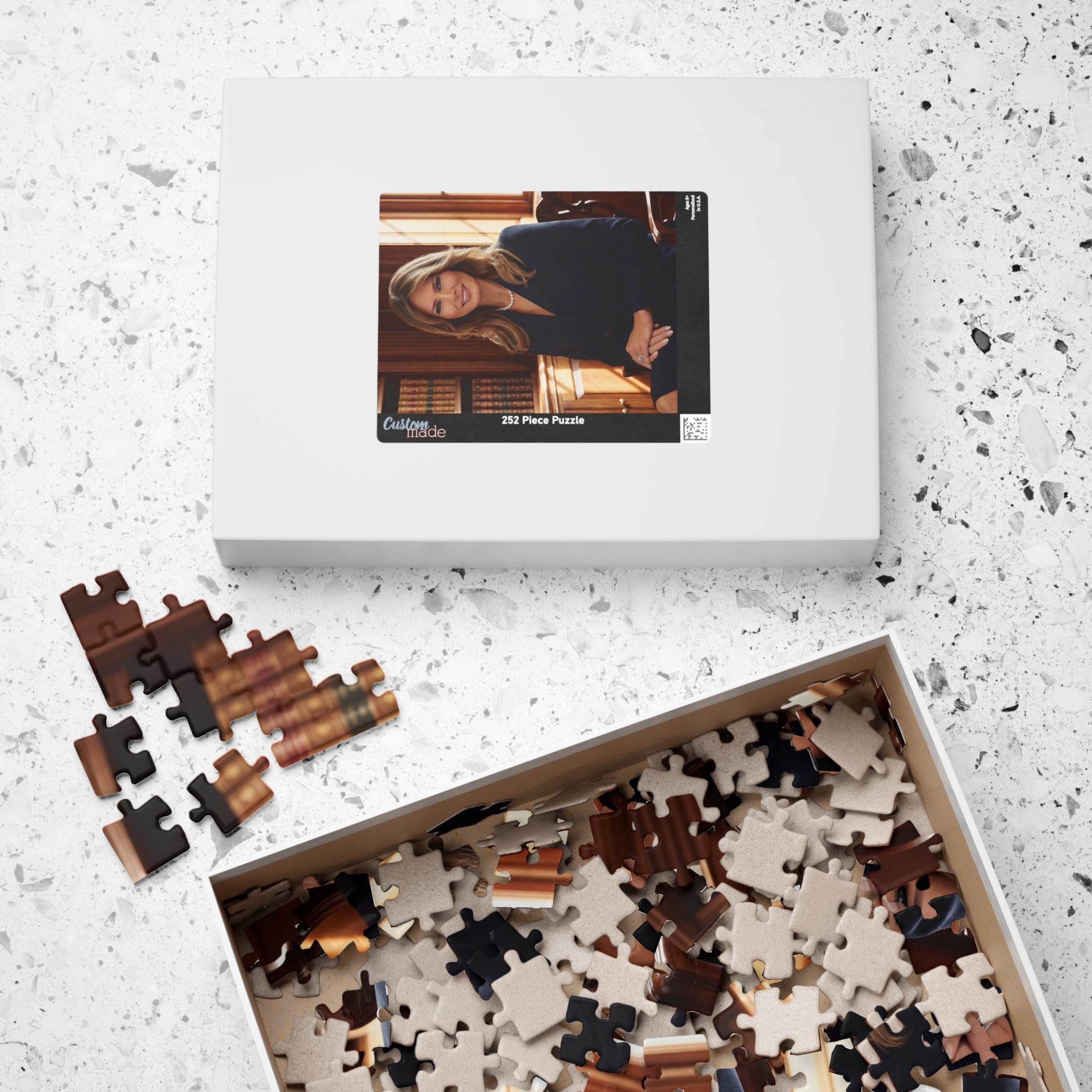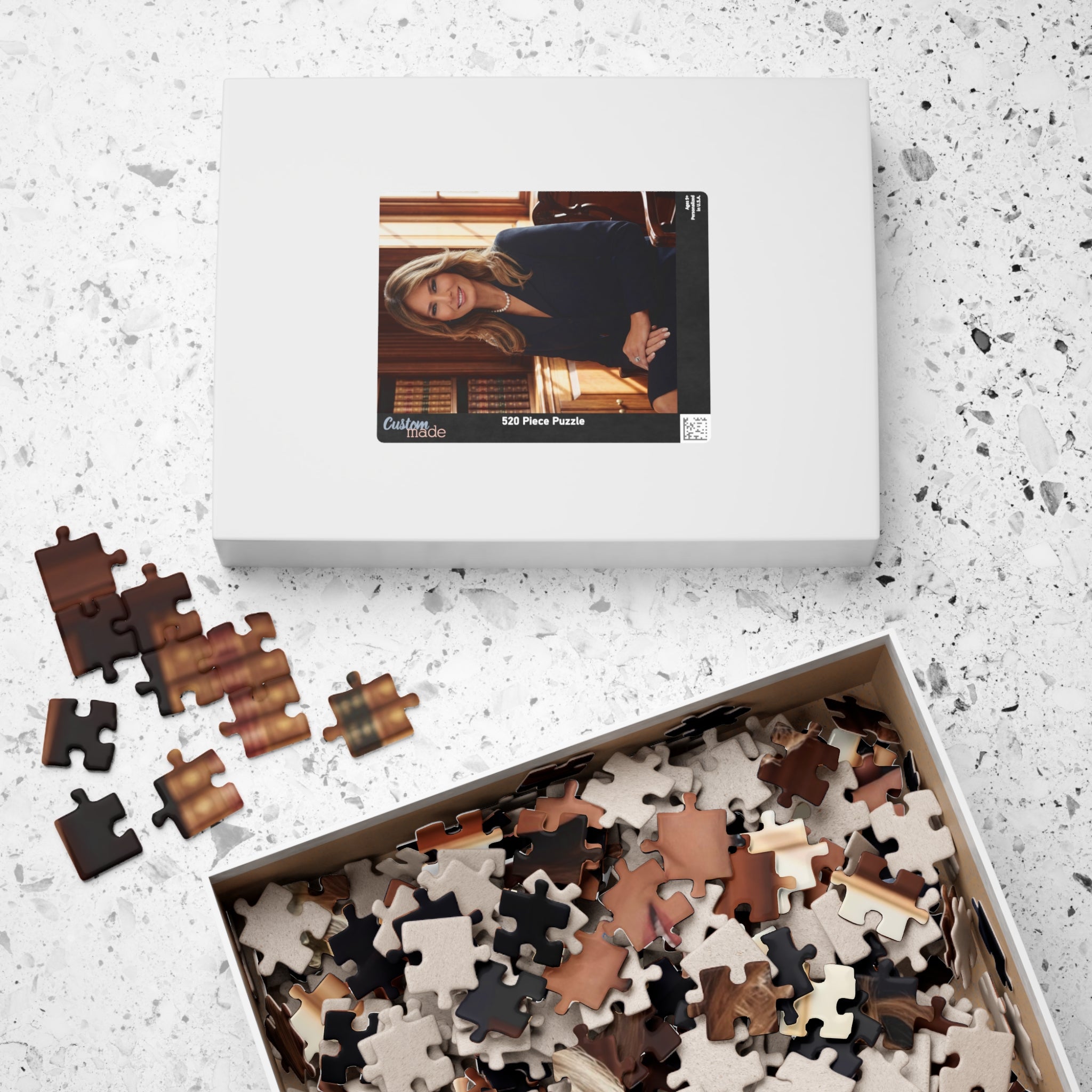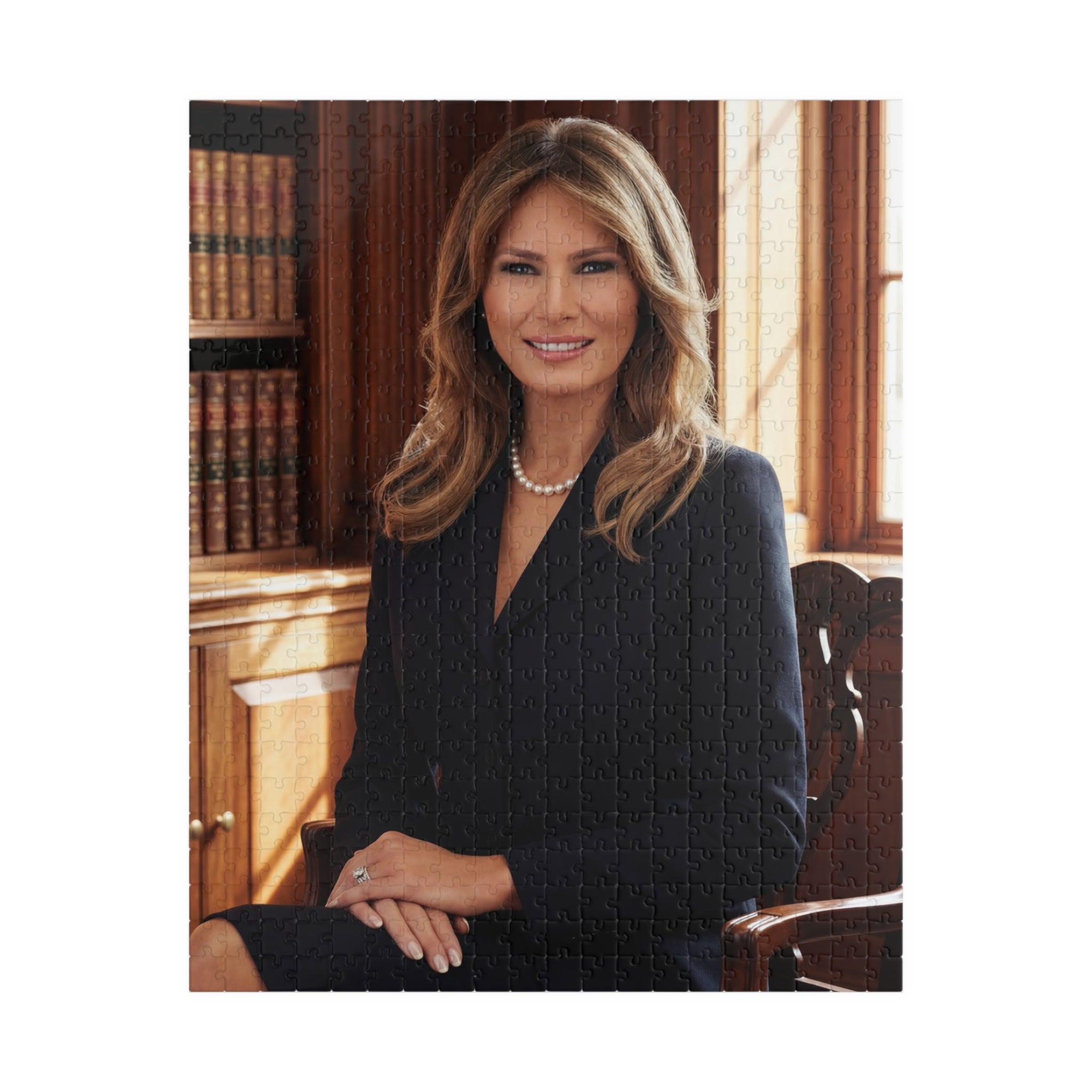 Bring timeless grace and American elegance into your home with this stunning First Lady–inspired portrait puzzle. Set in a classic library backdrop, this refined design captures poise, confidence, and sophistication. Perfect for fans of American history, collectors of presidential memorabilia, or anyone who appreciates iconic style.