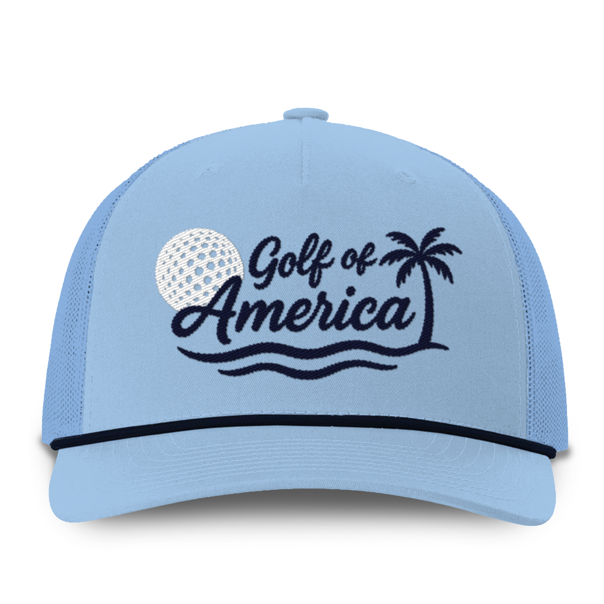 Hit the green with patriotic flair in the Golf of America Hat. Featuring a vintage-style golf ball and palm tree embroidered over classic beach, this cap brings together leisure, liberty, and lifestyle.