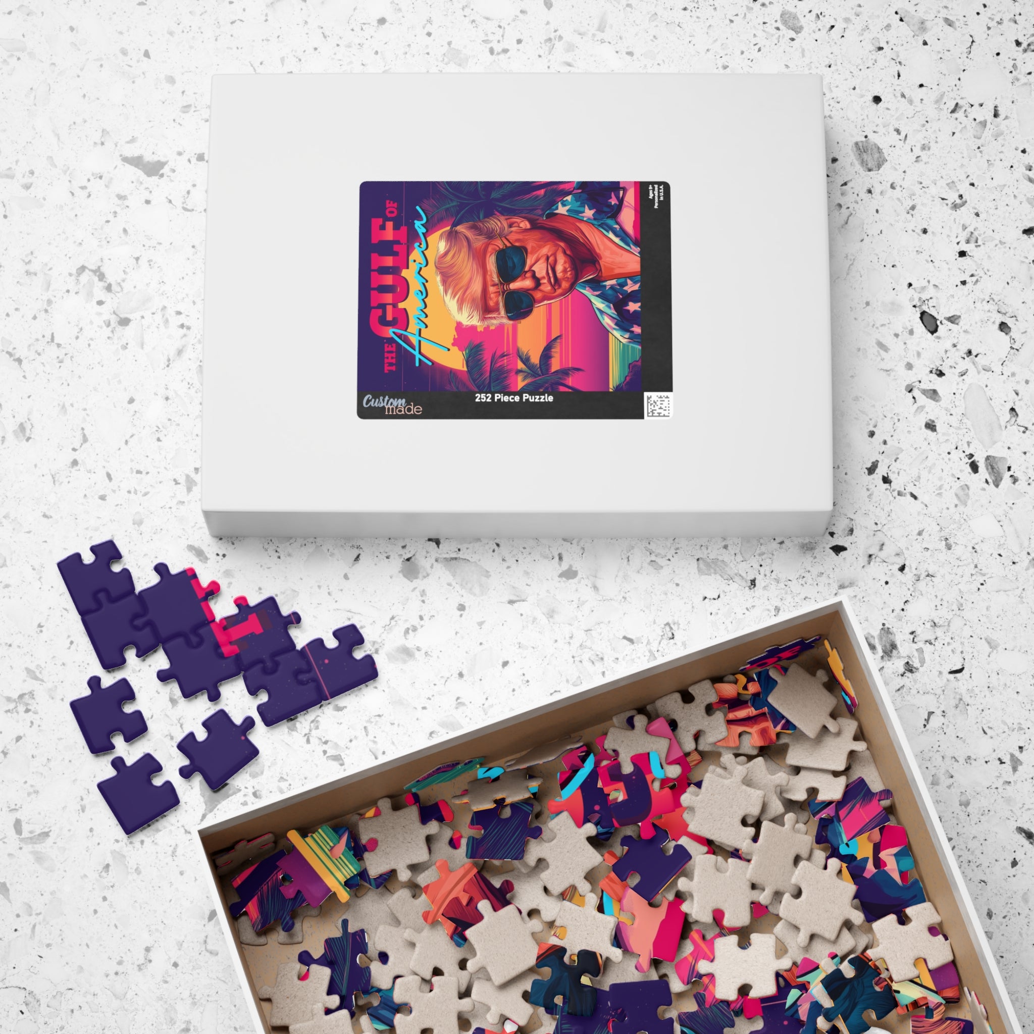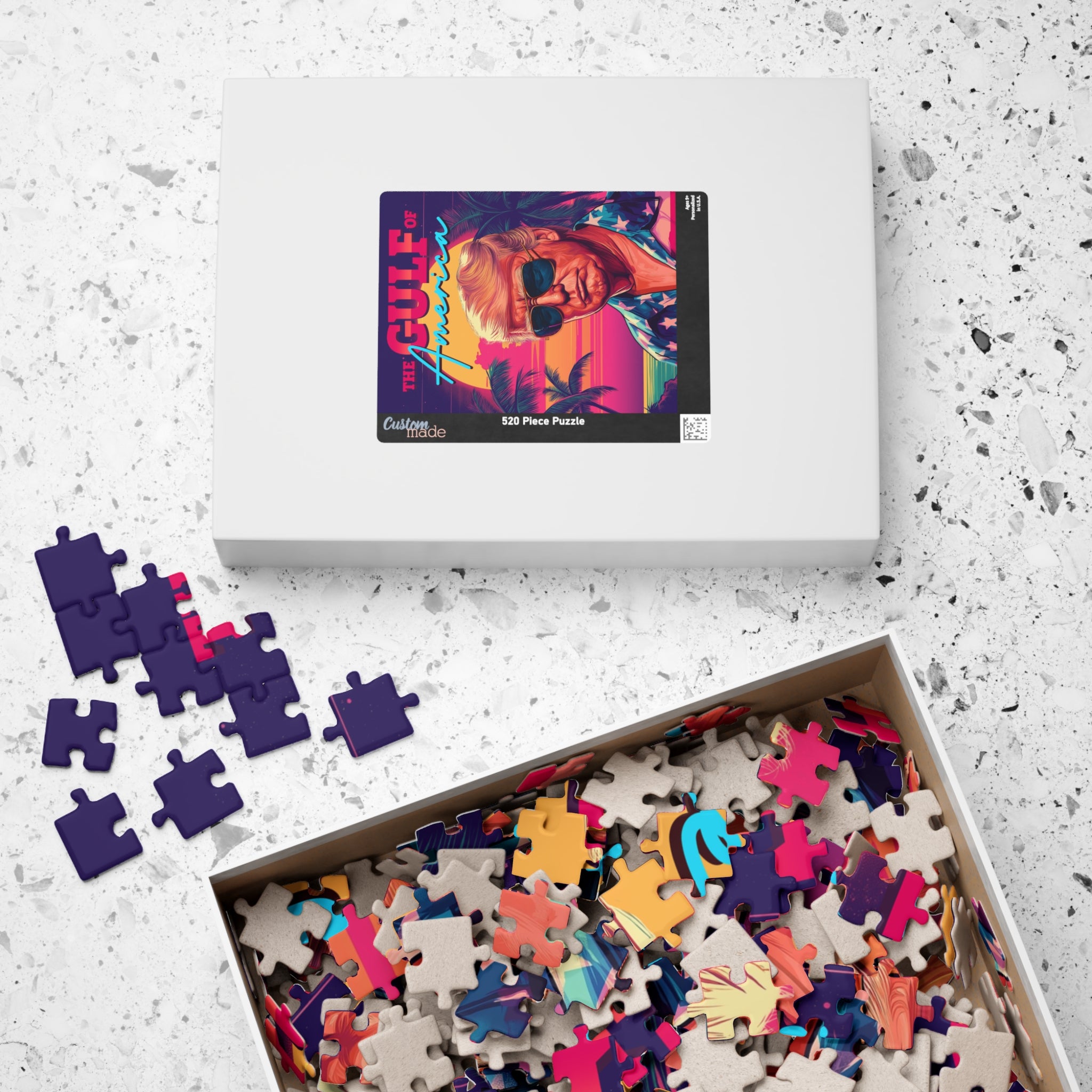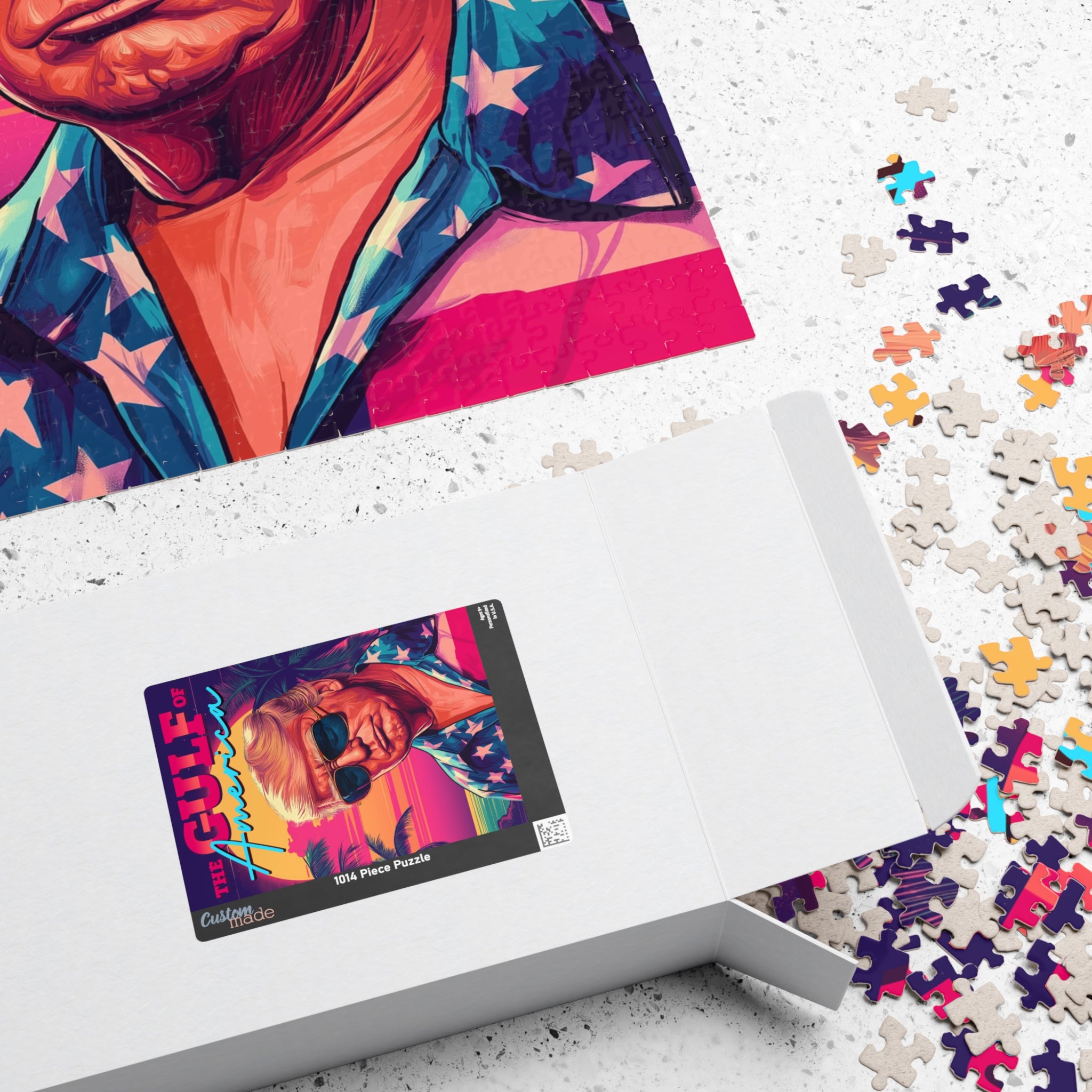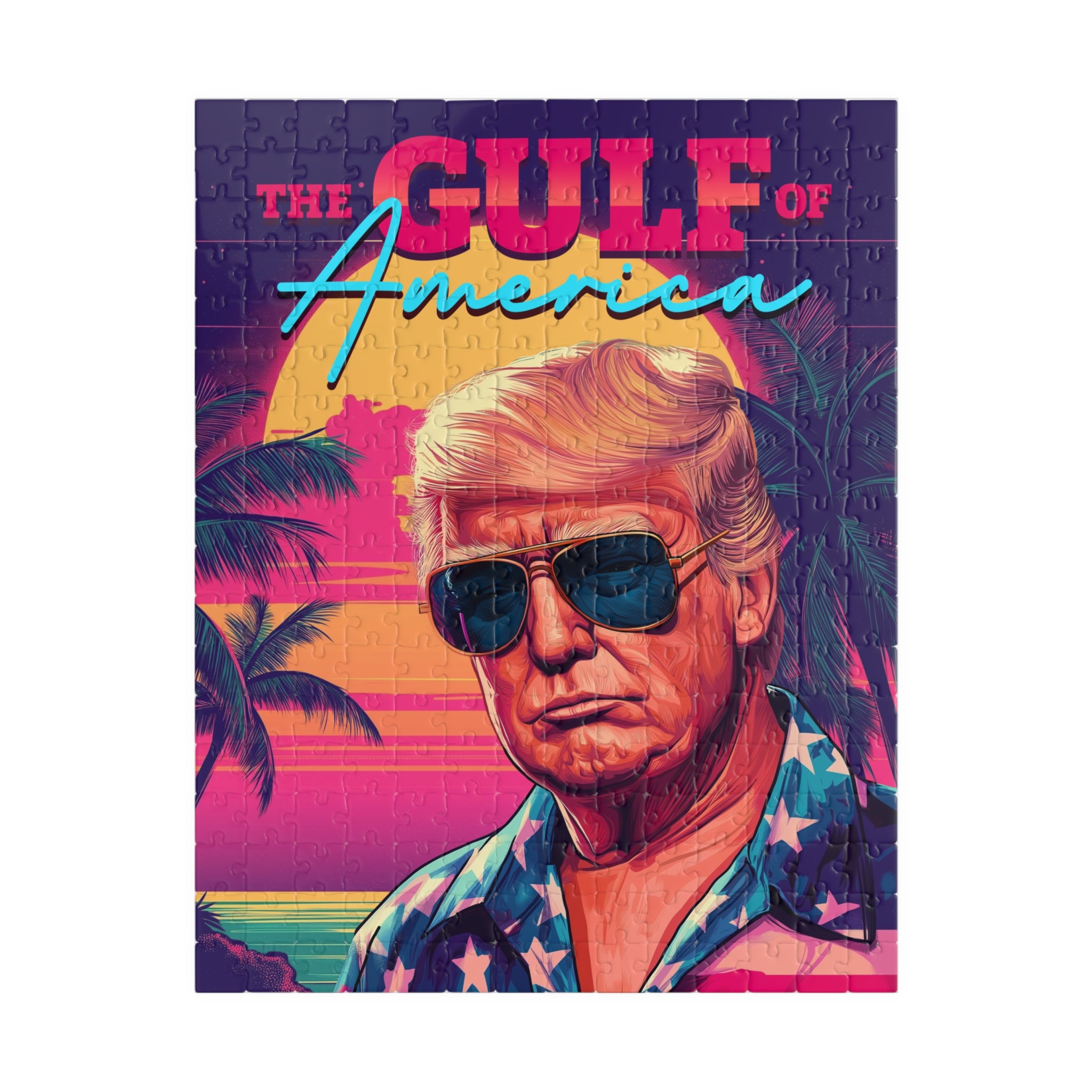 Turn up the heat with this bold, retro-style patriotic puzzle. Featuring a confident American leader in classic sunglasses and stars-and-stripes fashion, this design blends vintage vibes with modern patriotism. A fun and eye-catching addition to any puzzle collection.