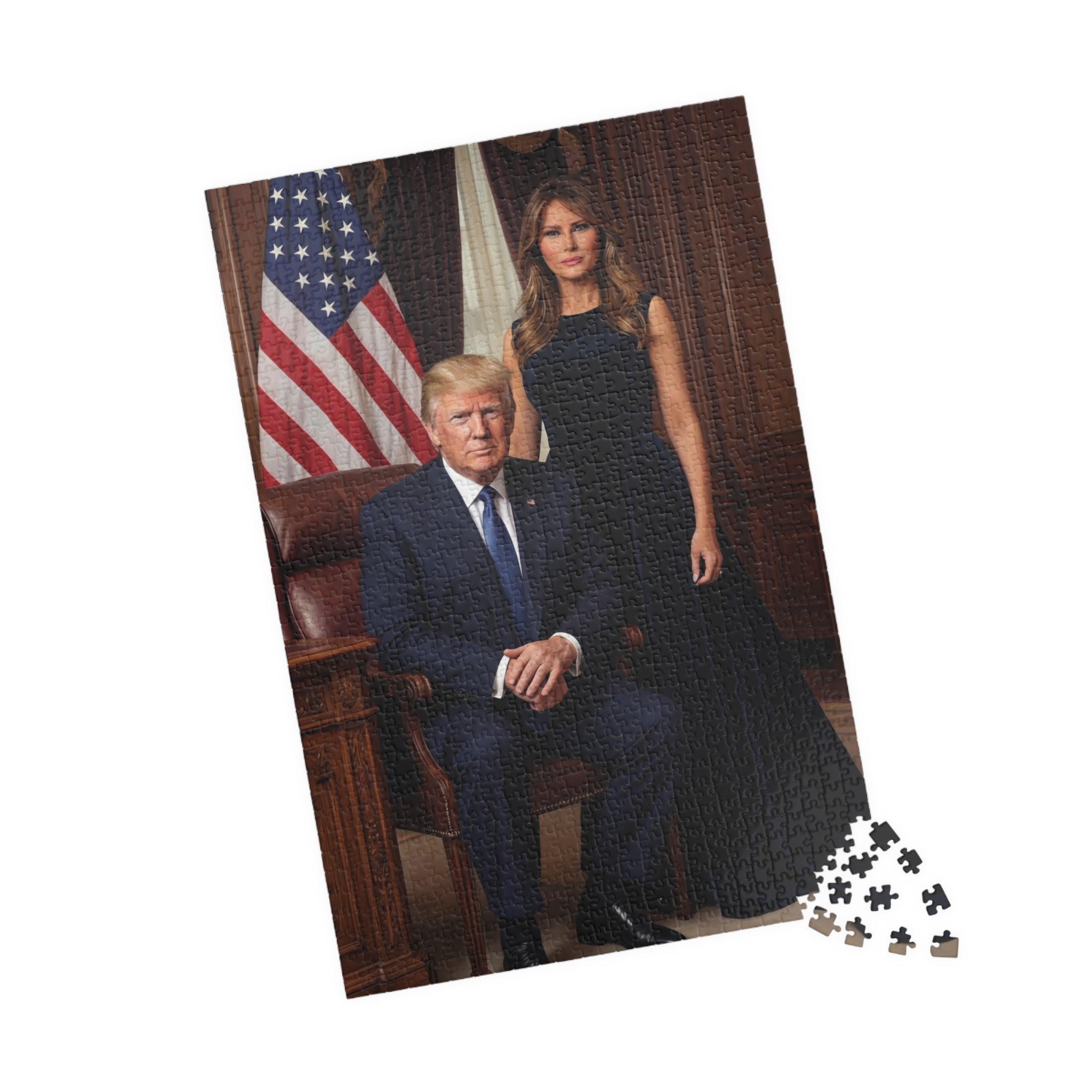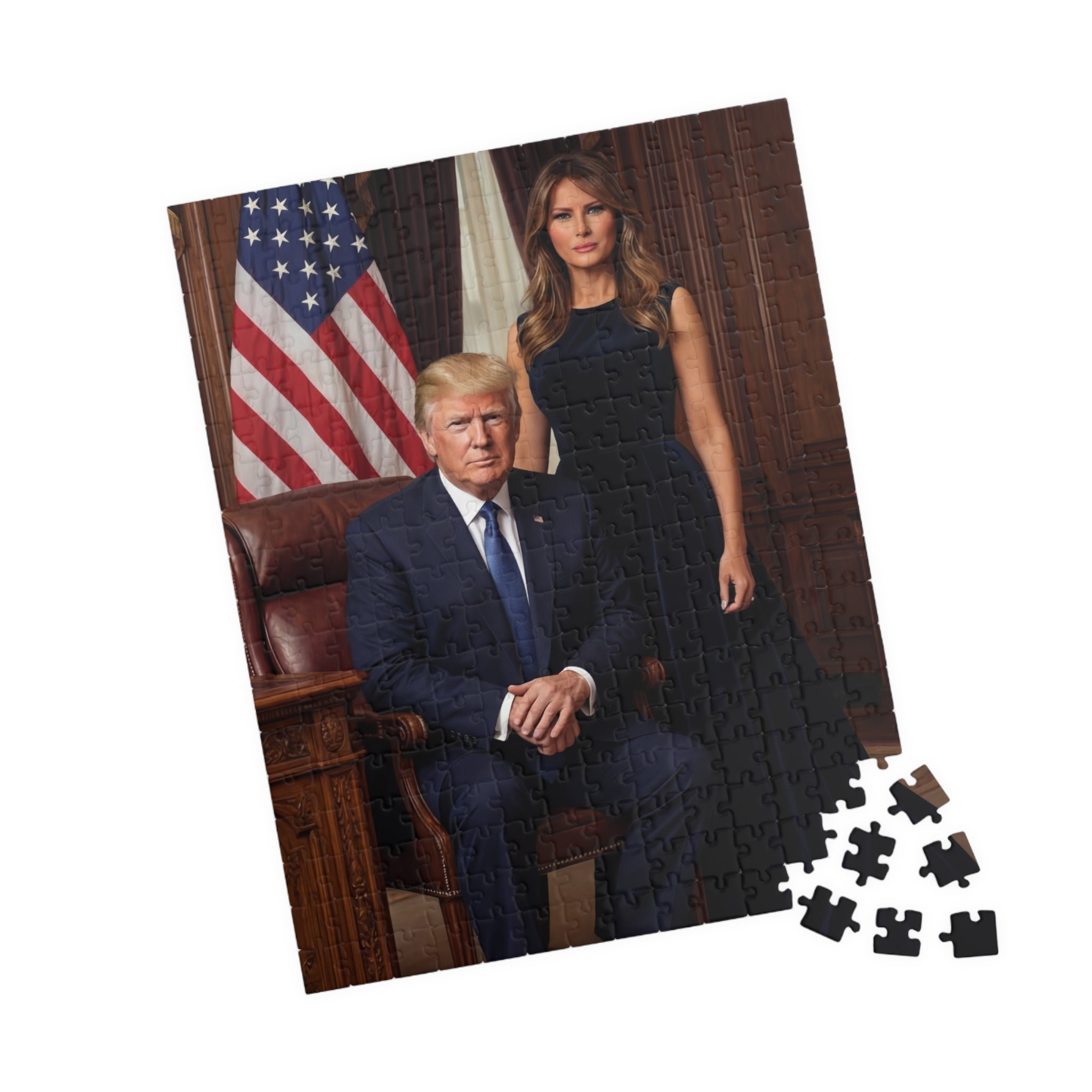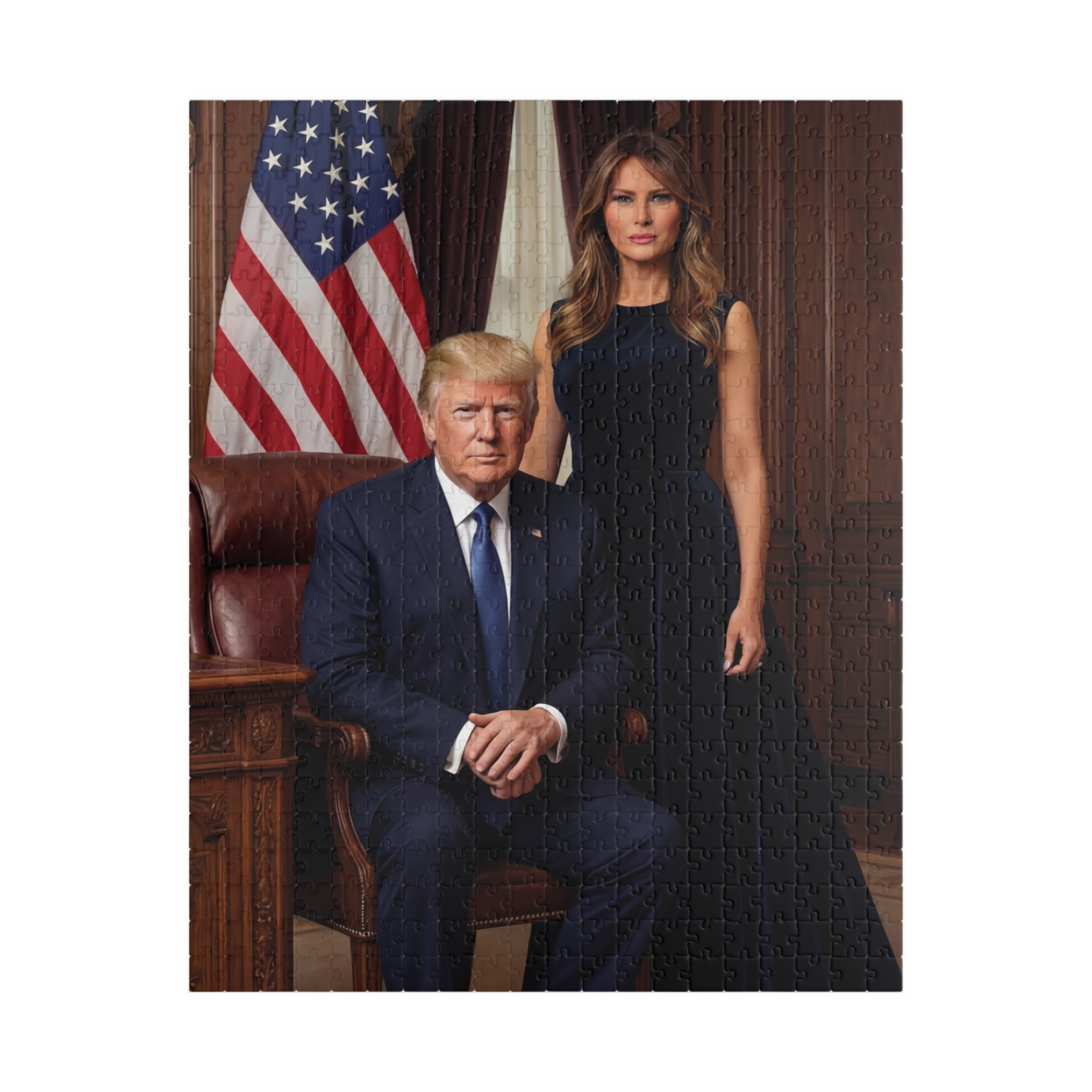 Celebrate American leadership and strength with this striking presidential couple portrait puzzle. Featuring a commanding Oval Office–style scene with patriotic symbolism, this design represents confidence, unity, and national pride. A must-have for collectors and supporters of bold American leadership.