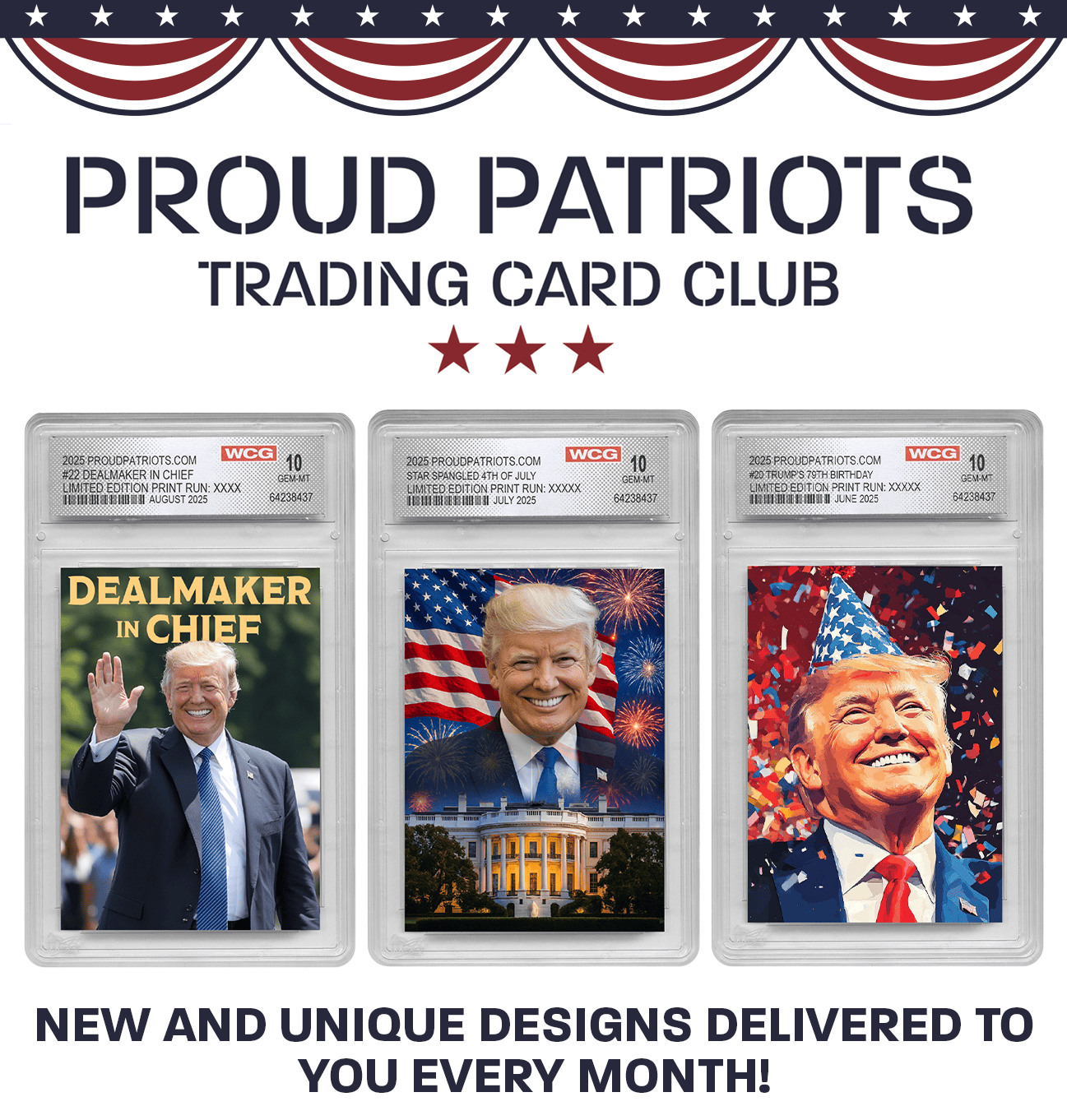 Each month's design is a limited print, never to be printed again & only available to our Proud Patriots Trading Card Club members. |