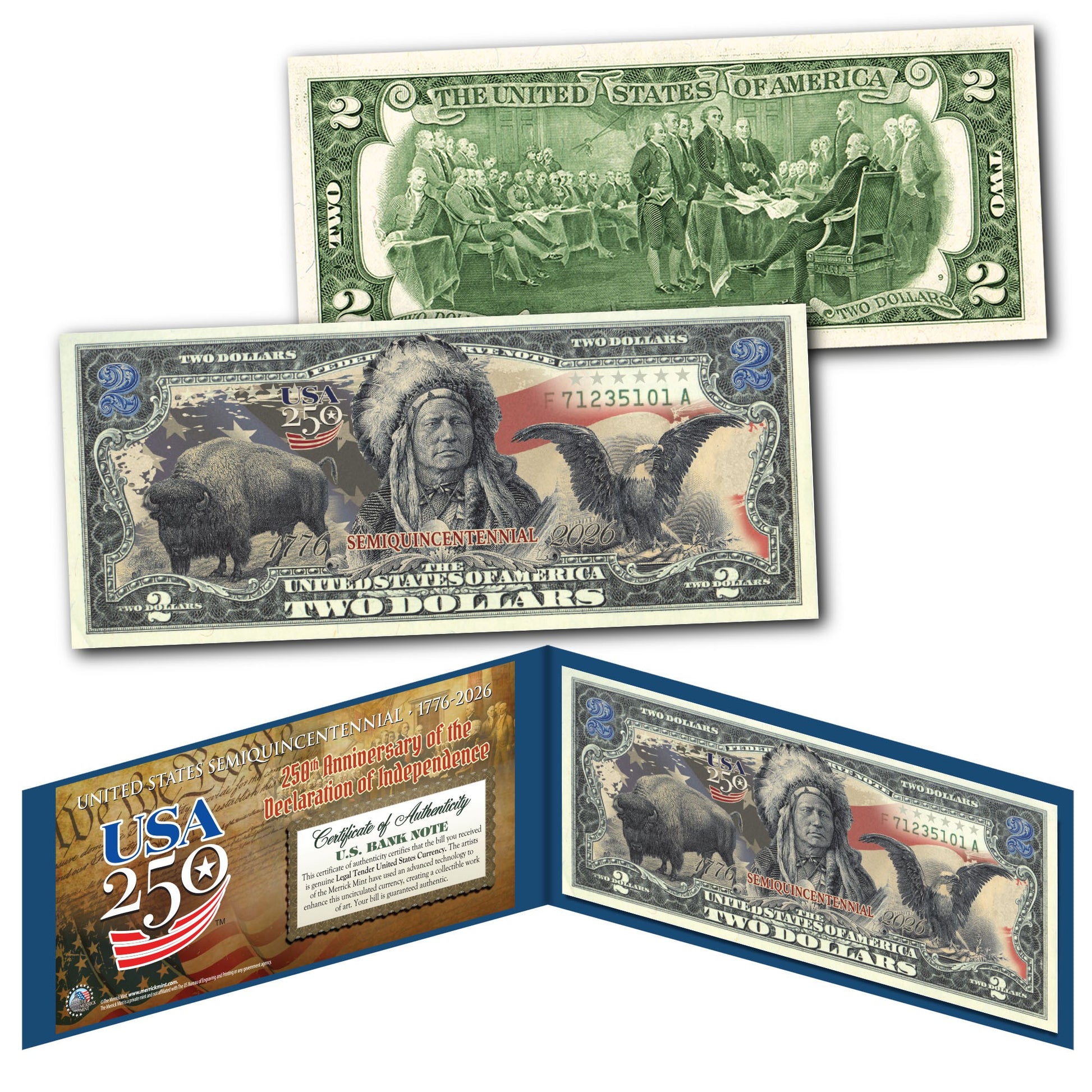 USA 250th Anniversary $2 Bill – Black Eagle, Indian Chief & American Bison | Genuine Legal Tender